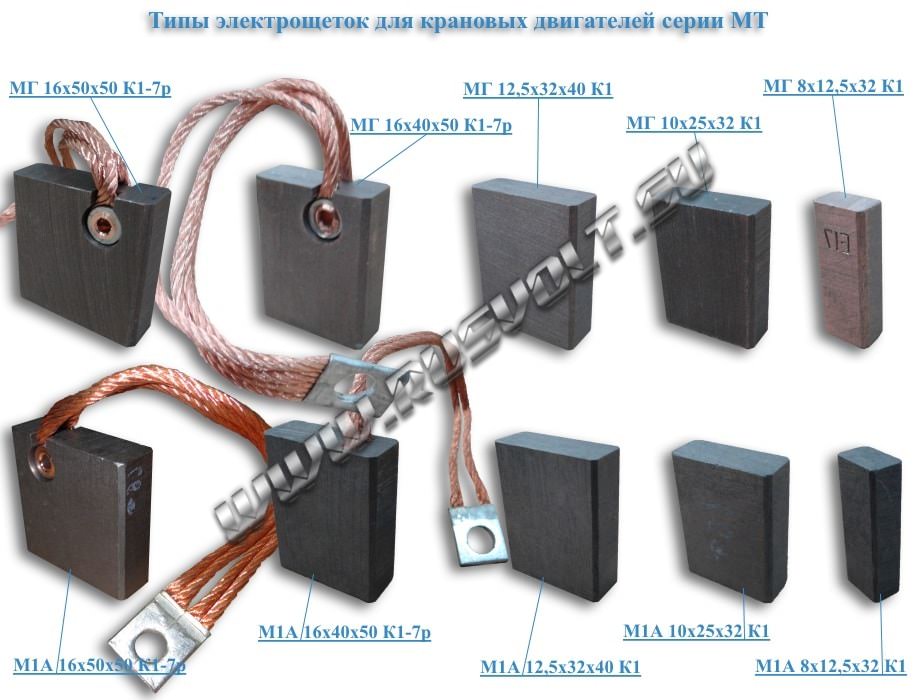 Крановые щетки М1А, М1, МГ используются в электродвигателях для крановых механизмов серий МТ от нулевого до седьмого габаритов (электродвигатели MTKF, MTKH, MTF, MTH, DMT, 4MTM, AMT, так же их маркируют по русски: МТКФ, МТКН, МТФ, МТН, ДМТ, 4МТМ, АМТ).