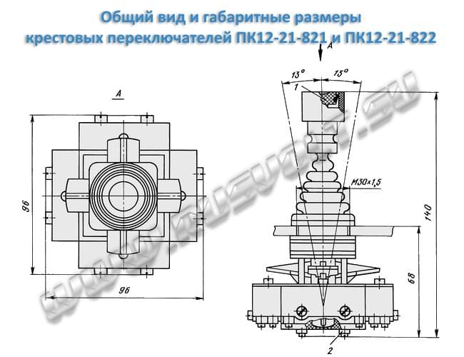 Конструкция и габаритные размеры выключателей крестовых ПК12-21-822 и 821