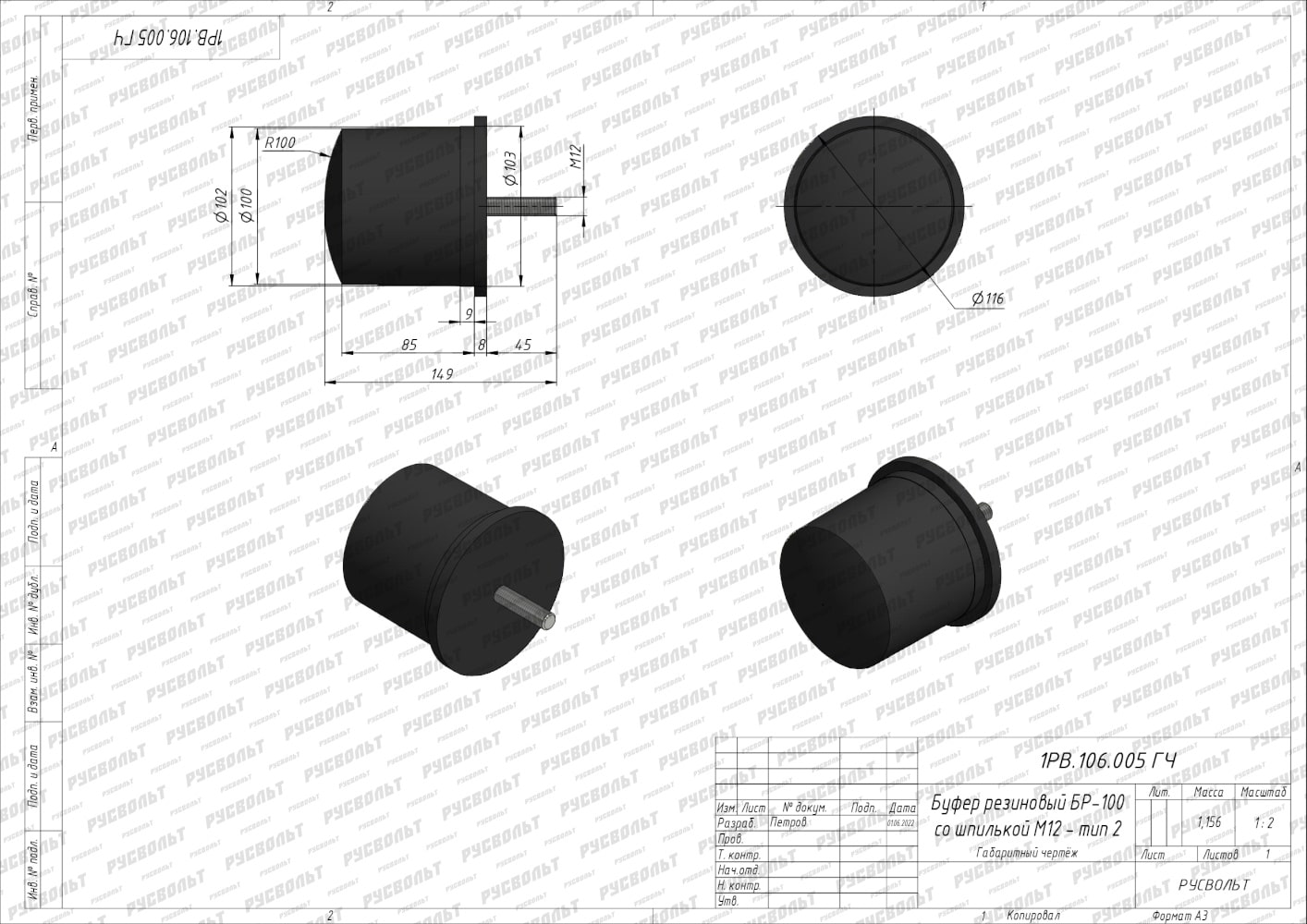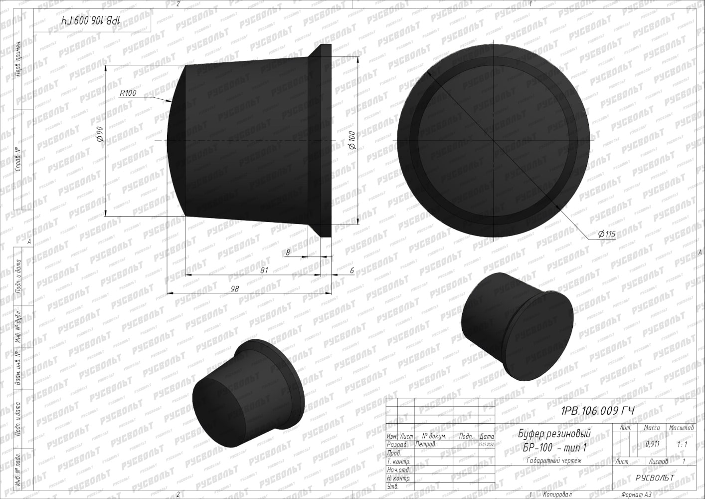 Резиновый буфер БР-100 - тип 1 (чертеж 1РВ.106.009 ГЧ)