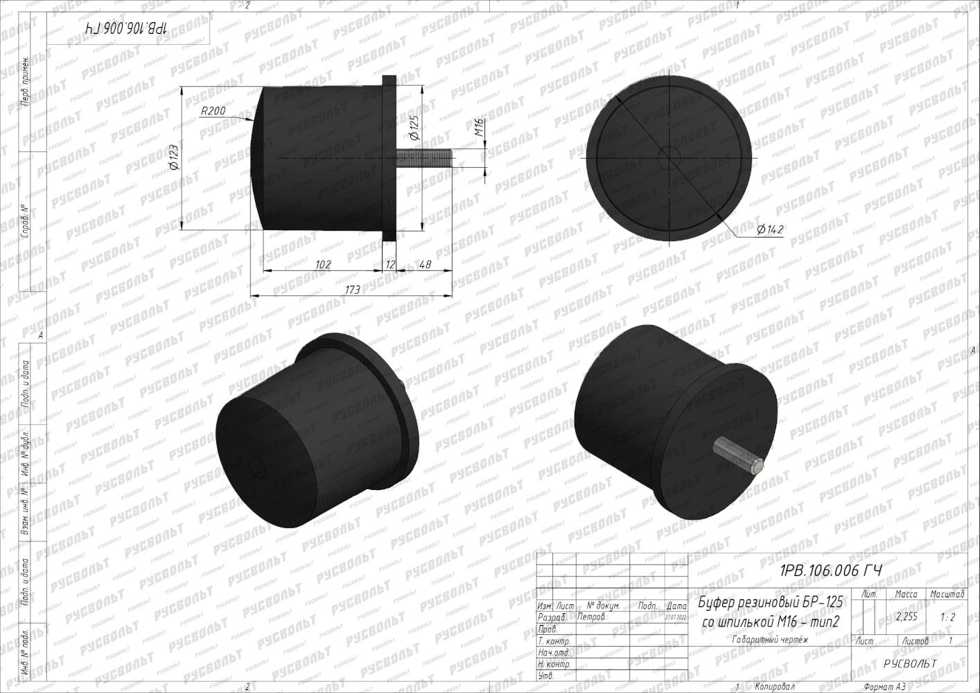 Резиновый буфер БР-125 со шпилькой - тип 2 (чертеж 1РВ.106.006 ГЧ)