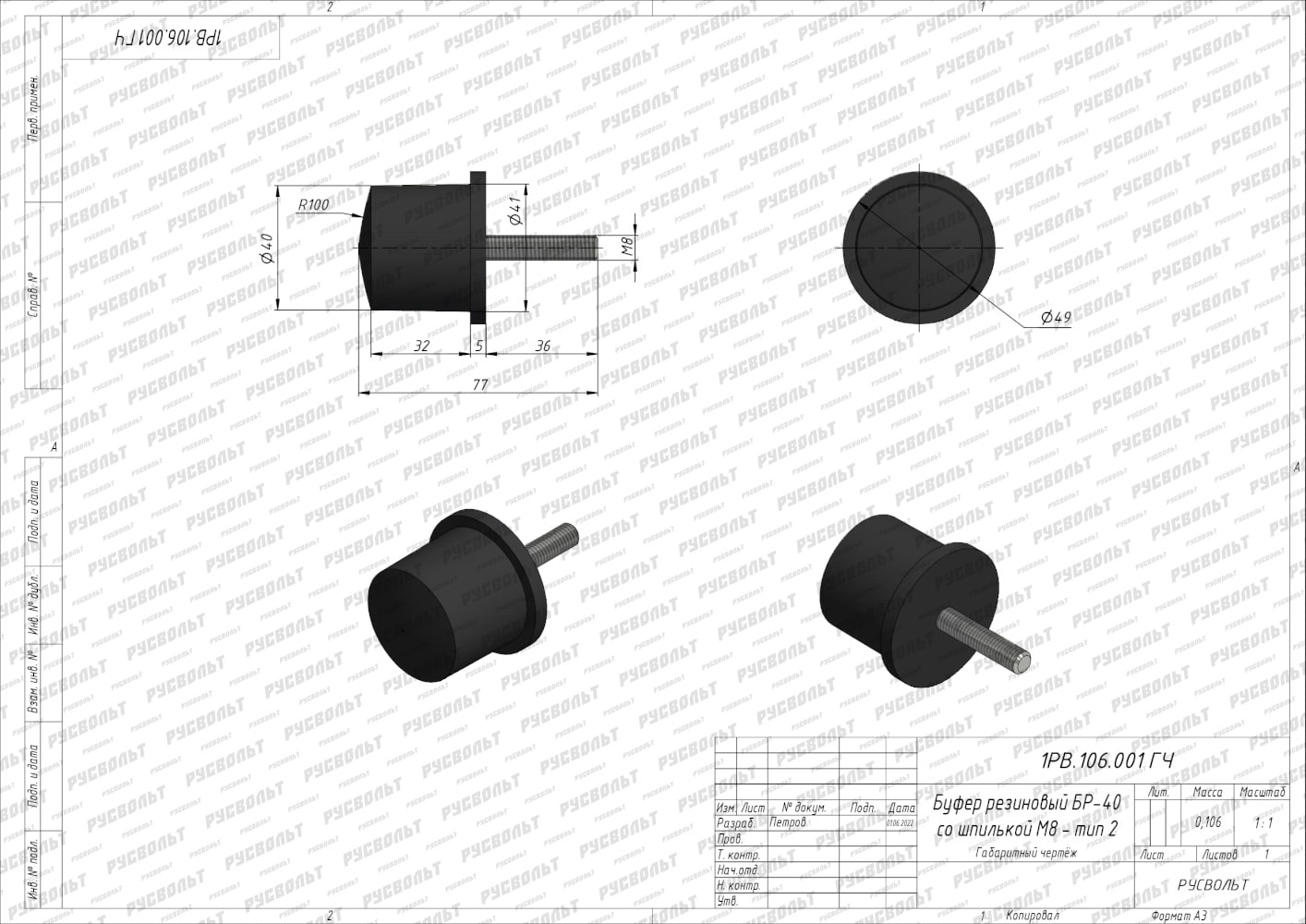 Резиновый буфер БР-40 со шпилькой - тип 2 (чертеж 1РВ.106.001 ГЧ)