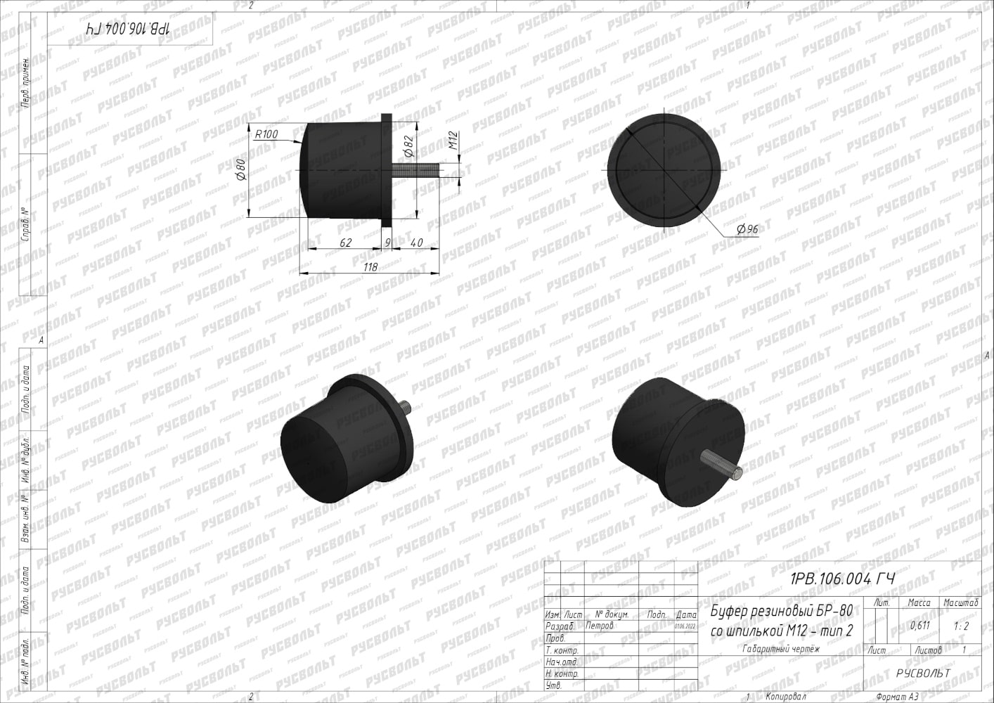 Резиновый буфер БР-80 со шпилькой - тип 2 (чертеж 1РВ.106.004 ГЧ)