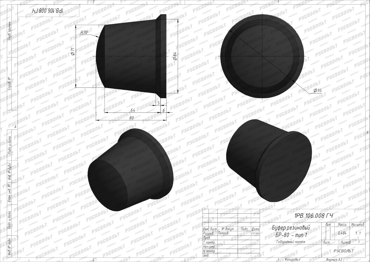 Резиновый буфер БР-80 - тип 1 (чертеж 1РВ.106.008 ГЧ)