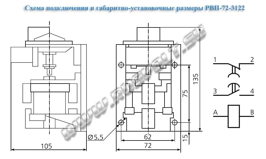 Схема подключения и габаритные размеры реле РВП 72-3122