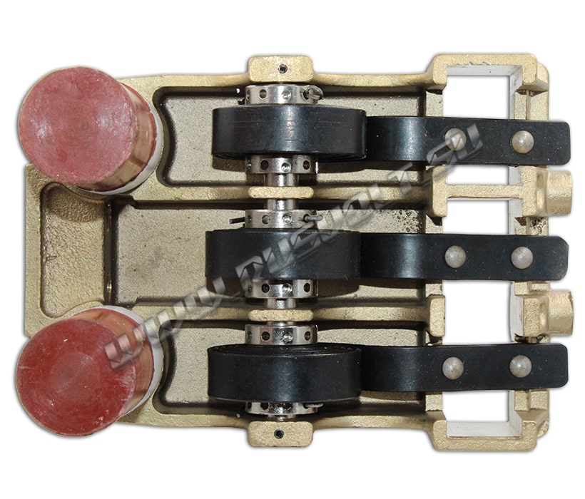 Щёткодержатель типа ДРПч3 25х40 чертеж 5ТХ.112.034 в основном применяются для электродвигателей ЭД-118, ТЭД-118 состоит из латунного литого корпуса, который в свою очередь укреплен на кронштейне. Сам кронштейн вварен в торцовую стенку остова. К тому же в его корпус запрессовываются два стальных пальца, которые необходимы для крепления щеткодержателей в кронштейне. От корпуса пальцы изолированы прессматериалом или изоляционным твердым слоем из специального эпоксидного компаунда, непосредственно на который и надеваются изоляторы. В корпусе ДРПч 3(25х40) имеются 2 гнезда для графитовых щеток. В самое первое его гнездо вставляется одна пара электрощеток, а в другое — две пары. Электрощетки в его гнездах должны свободно перемещаться, но не качаться. Нажатие электрощеток на коллектор электродвигателя осуществляется с помощью спиральных пружин и регулируется поворотом втулки, которая находится в центре пружины. Они снабжены гибкими шунтами, которые крепятся болтами непосредственно к корпусу щеткодержателя. Для большего удобства осмотра и конечно же замены щеток на щеткодержателях установлены специальные стойки с заплечиками, с помощью которых вполне можно фиксировать пружины в приподнятом положении.