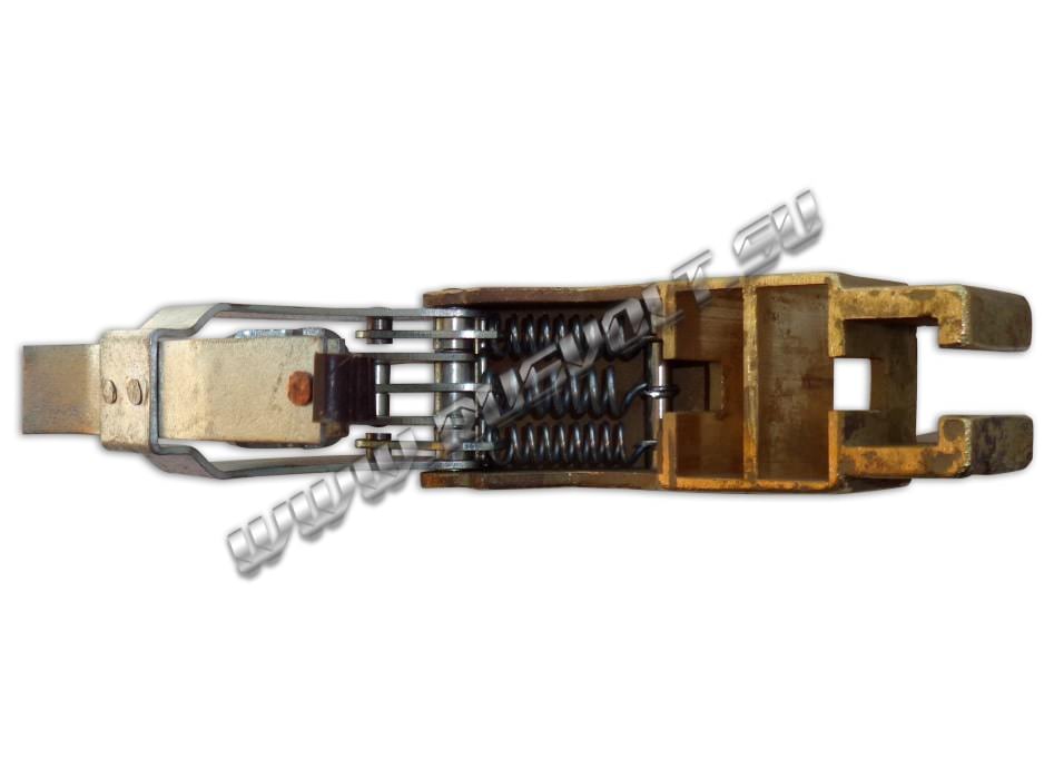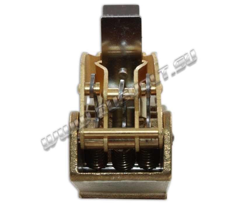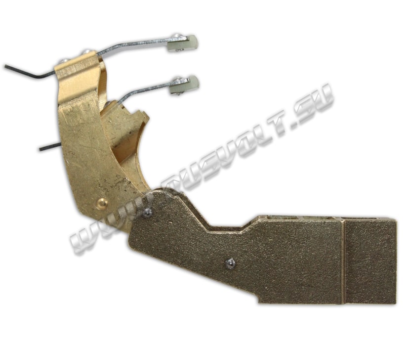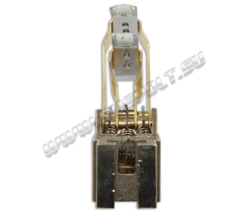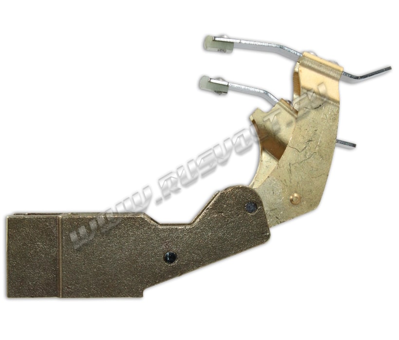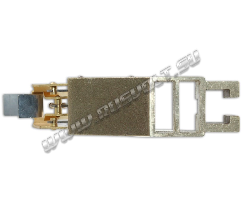 Щёткодержатель типа ДРПк2 12,5х32 это тандем-щеткодержатель радиальный со специальной нажимной цилиндрической пружиной растяжения и обоймами для двух щёток. Давление пружины на графитовую щётку регулируется и передаётся с помощью рычага. Щеткодержатель крепится на круглый палец (бракет) со стороны обоймы. Изготавливается под давлением из латуни с помощью фрезерной обработки путем протяжки, сверления и запиловки. В данных щеткодержателях используются электрощетки размером 12,5х32х64мм.