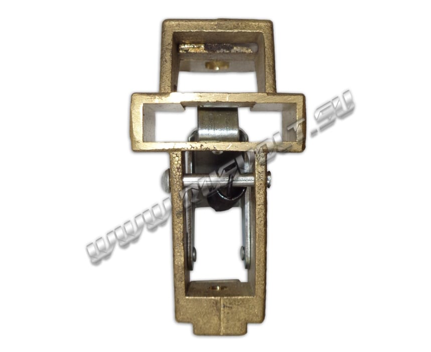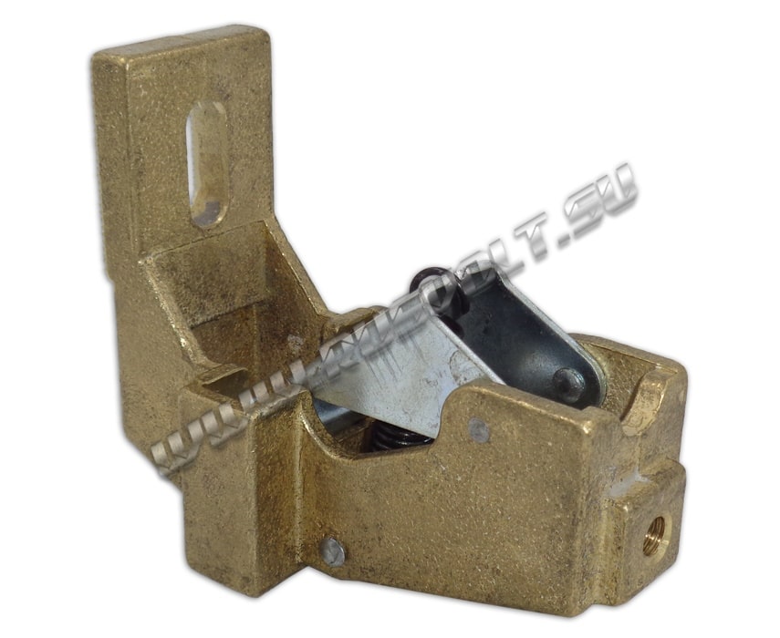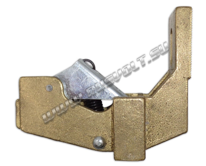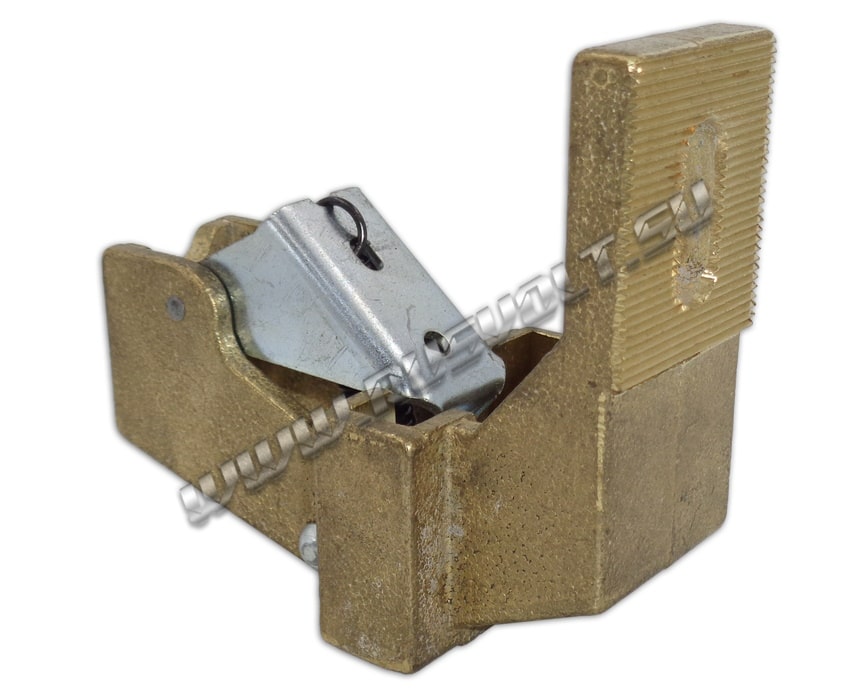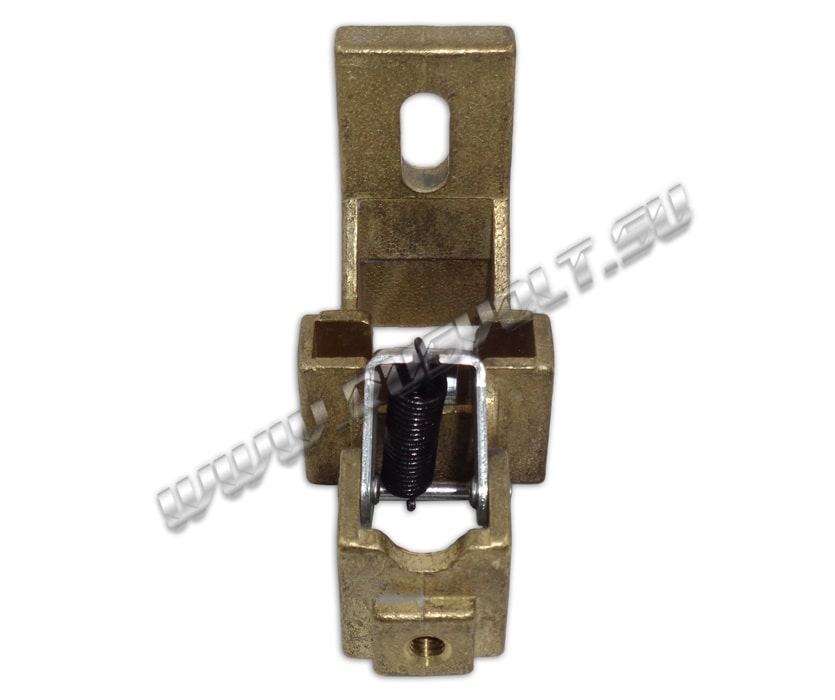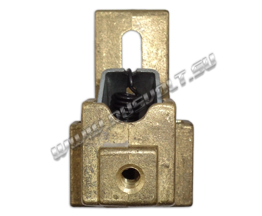 Щёткодержатель типа ДП (ДПЭ) 12,5х50 со специальной нажимной цилиндрической пружиной растяжения, радиальный, с разъемом для одной щётки размером 12,5х50х64мм. Давление пружины на графитовую щётку передаётся с помощью рычага и не регулируется. Щеткодержатель крепится на круглый палец (бракет) со стороны обоймы. Изготавливается под давлением из латуни с помощью фрезерной обработки путем протяжки, сверления и запиловки.