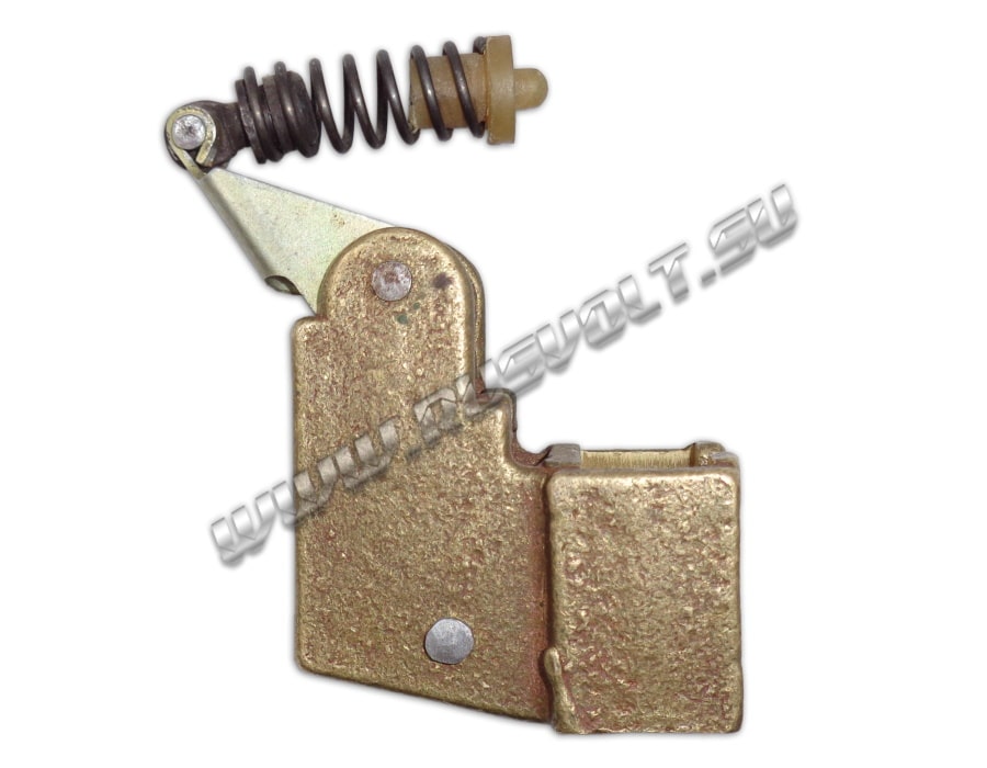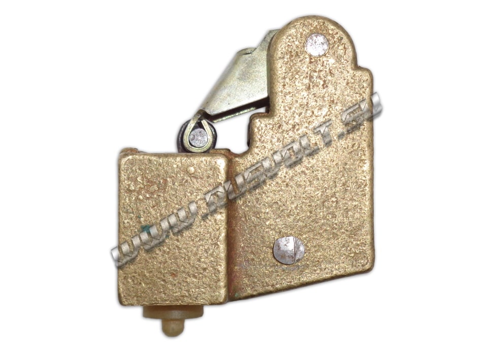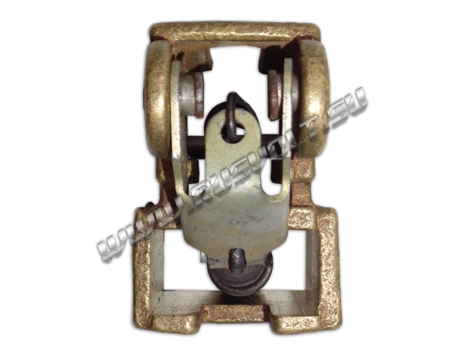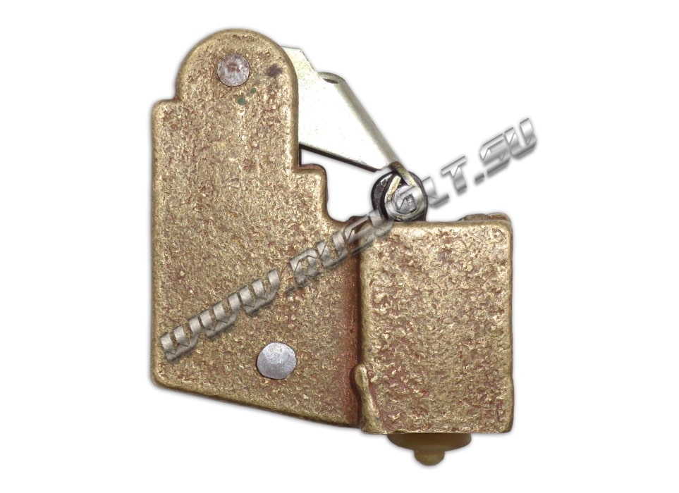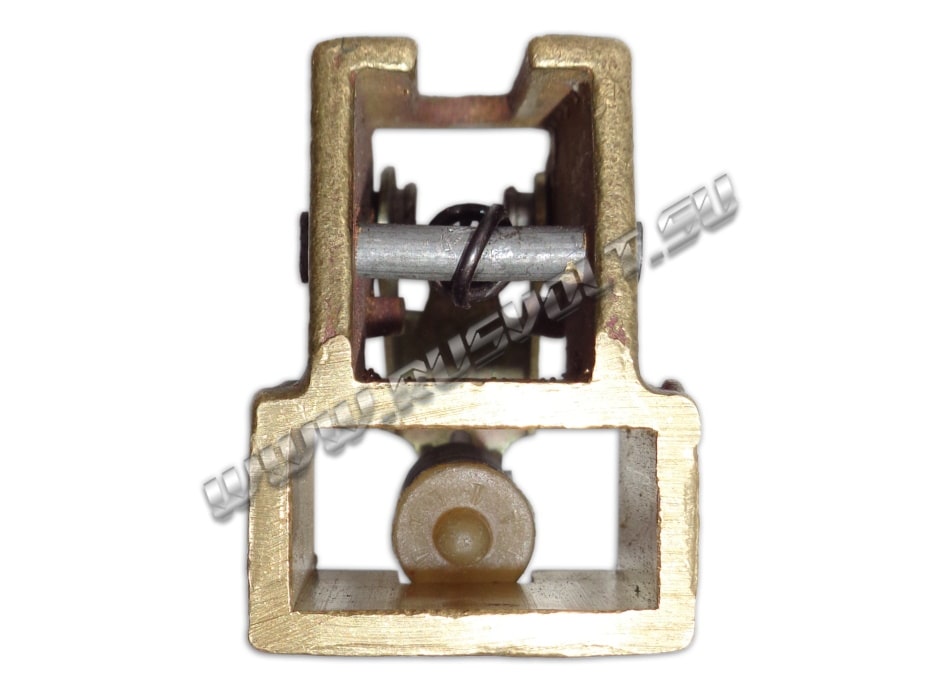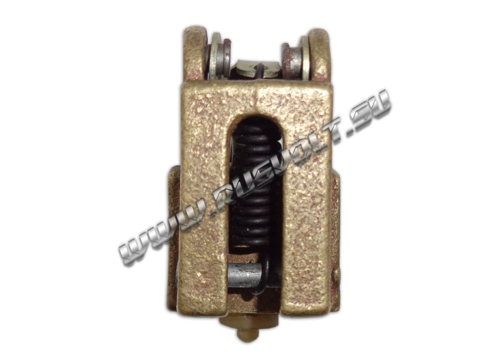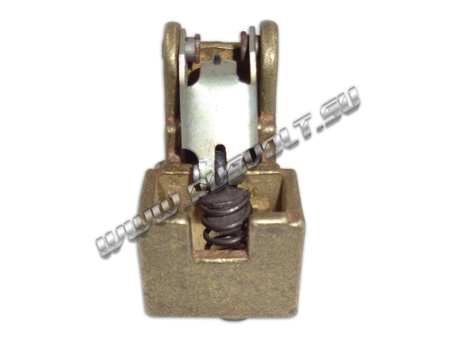 Щёткодержатель типа ДГ 12,5х25 чертеж 5БХ.112.004.2 со специальной нажимной цилиндрической пружиной растяжения, радиальный, с разъемом для одной щётки. Давление пружины на графитовую щётку передаётся с помощью рычага и не регулируется. Щеткодержатель крепится на круглый палец (бракет) со стороны обоймы. Изготавливается под давлением из латуни с помощью фрезерной обработки путем протяжки, сверления и запиловки.