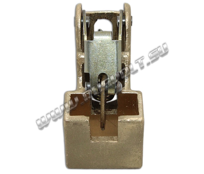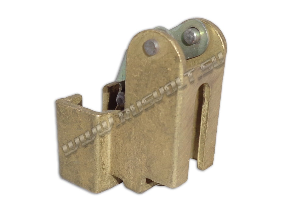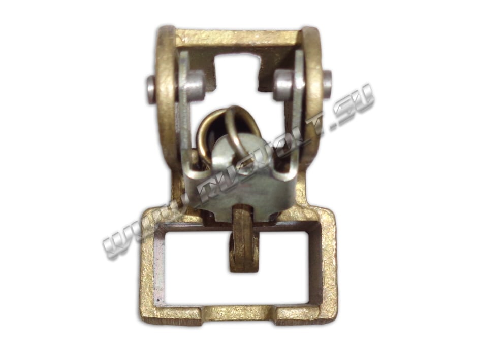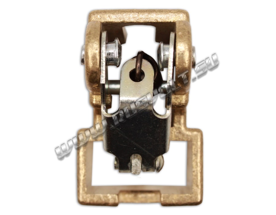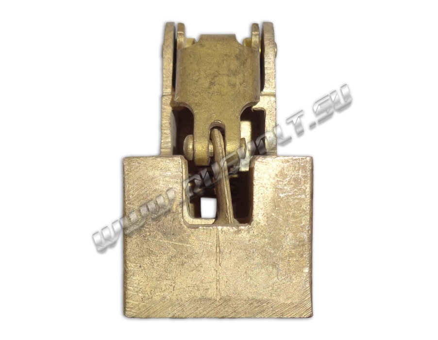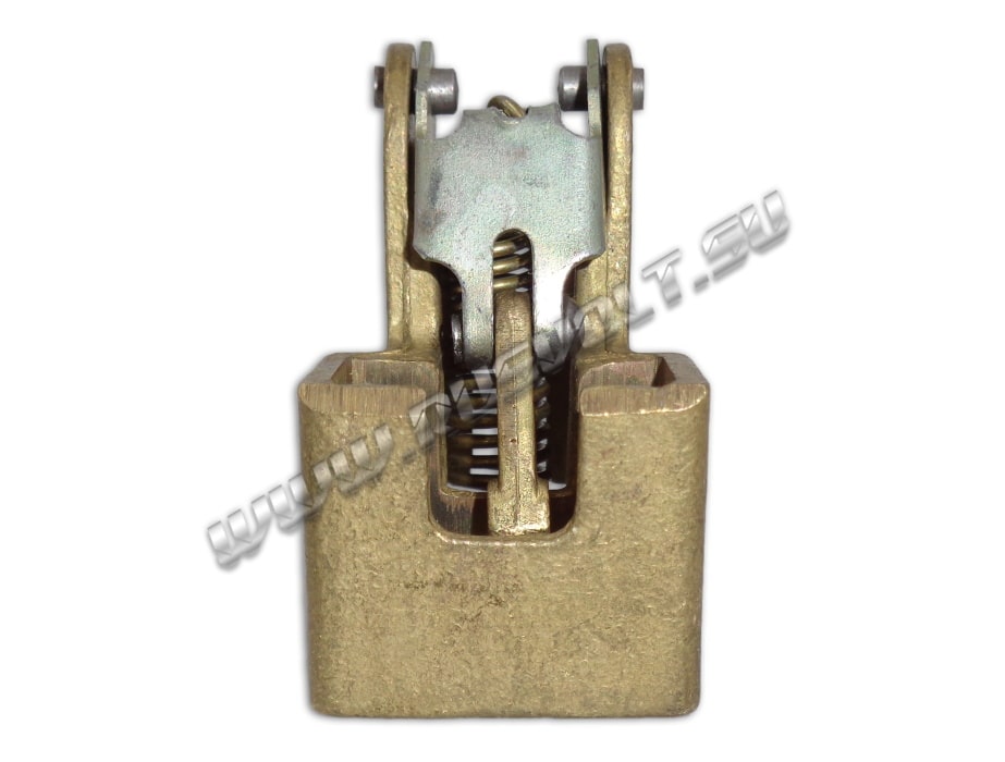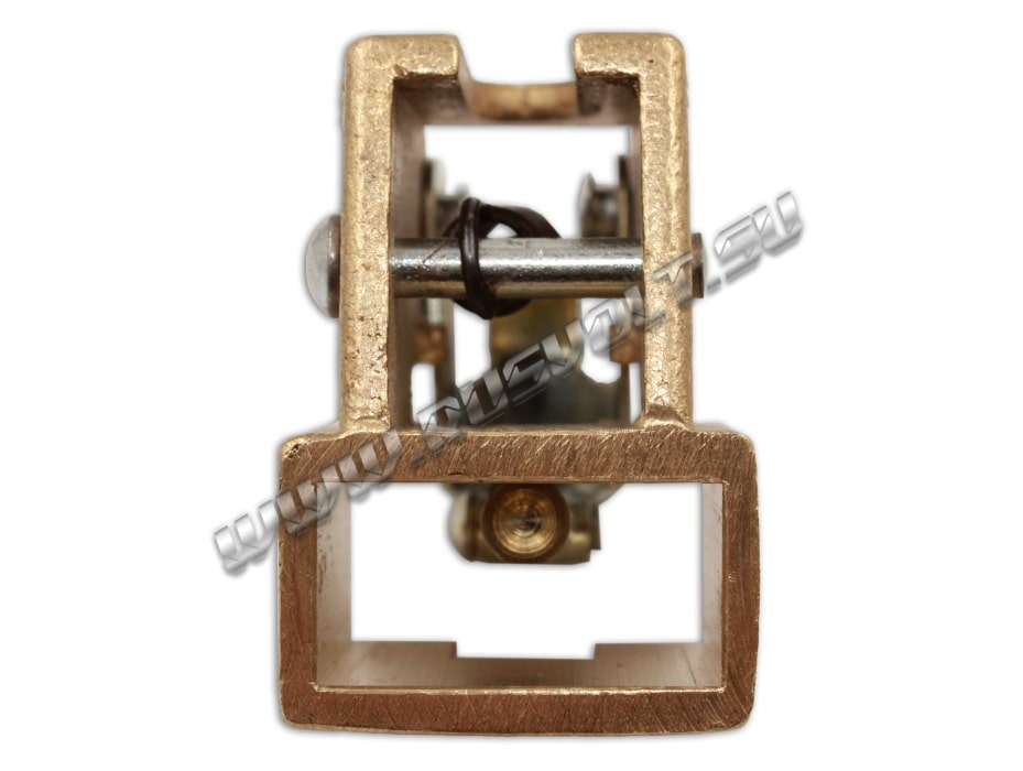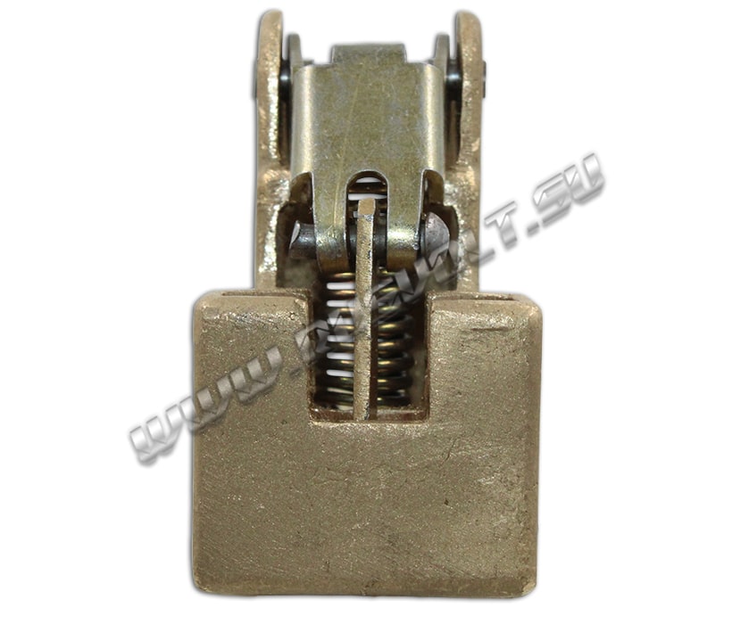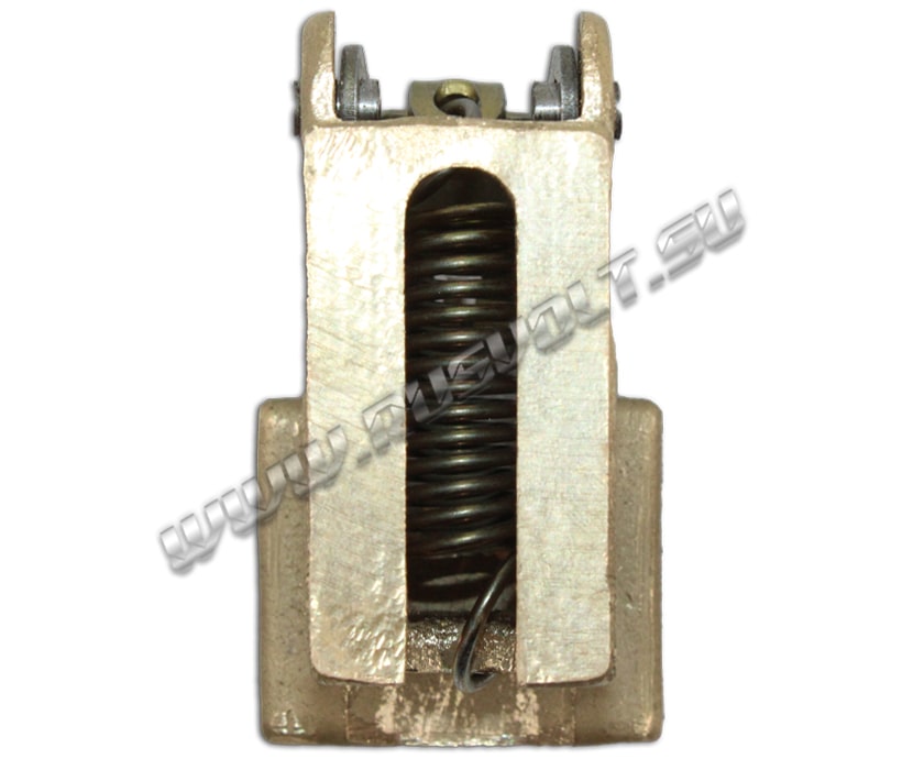 Щёткодержатель типа ДГМ 12,5х25 чертеж 5БС.112.118 или 5БС.112.118-02 со специальной нажимной цилиндрической пружиной растяжения, радиальный, с разъемом для одной щётки размером 12,5х25х40мм. Давление пружины на графитовую щётку передаётся с помощью рычага и не регулируется. Щеткодержатель крепится на круглый палец (бракет) со стороны обоймы. Изготавливается под давлением из латуни с помощью фрезерной обработки путем протяжки, сверления и запиловки.