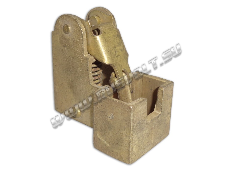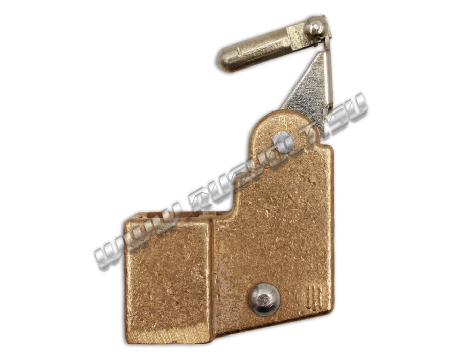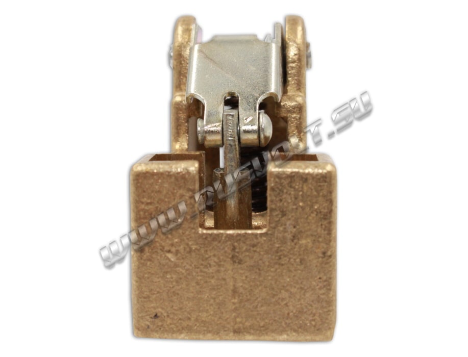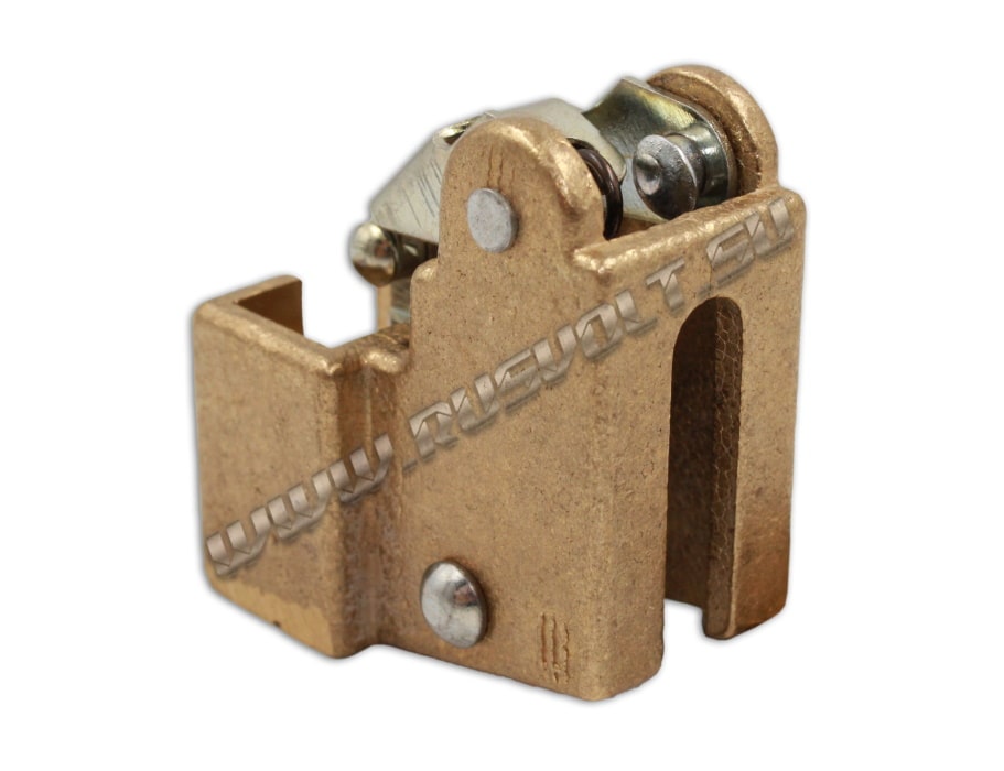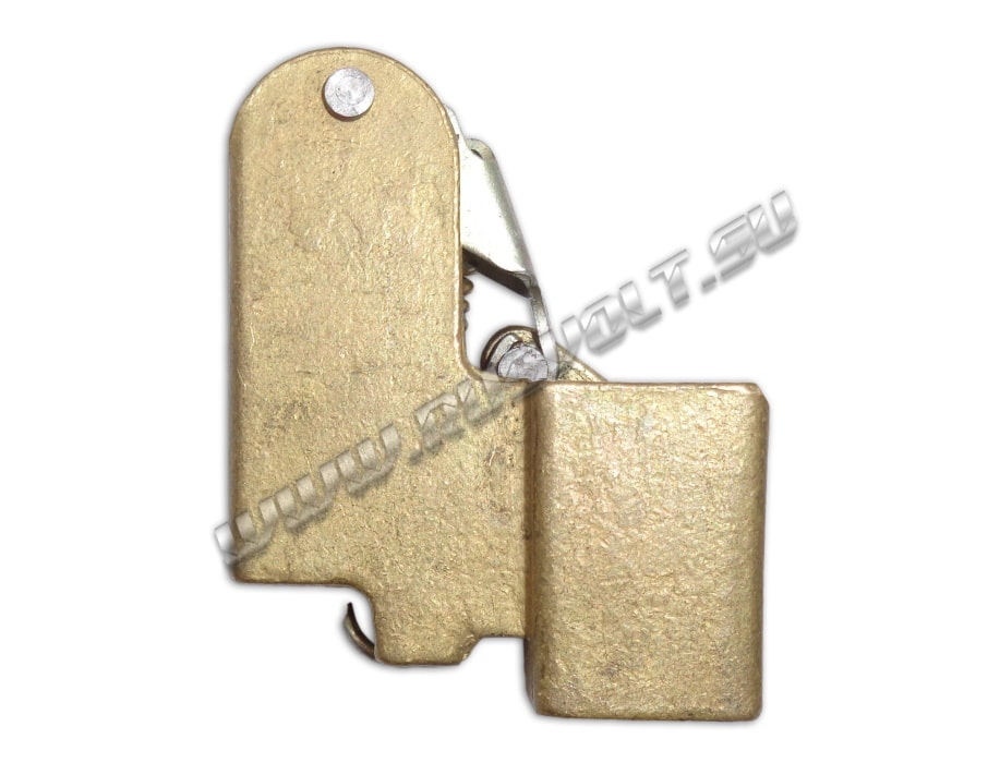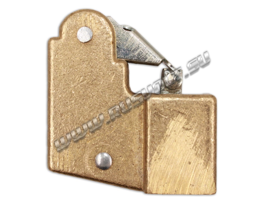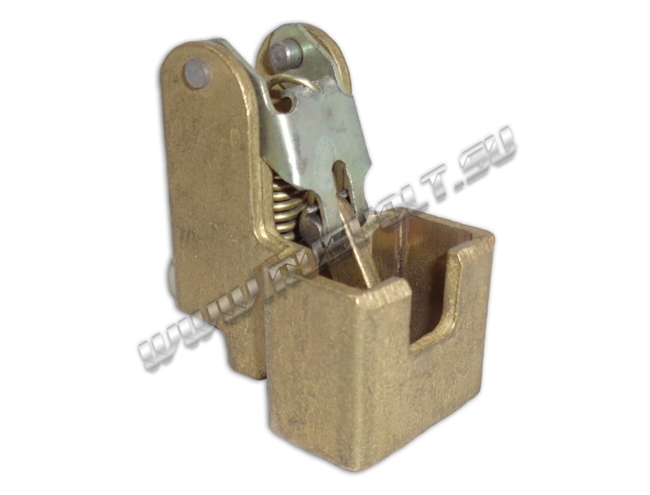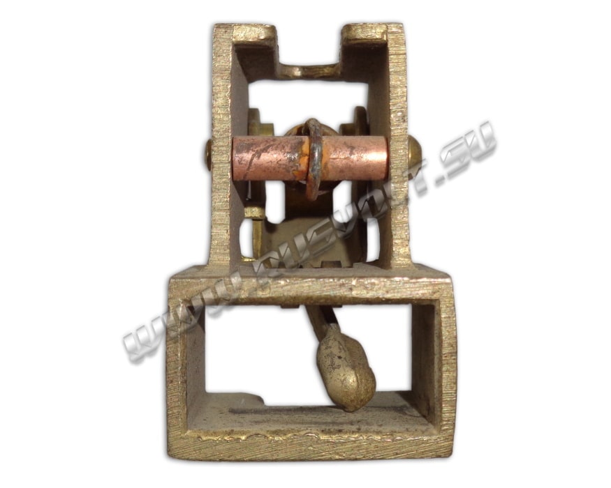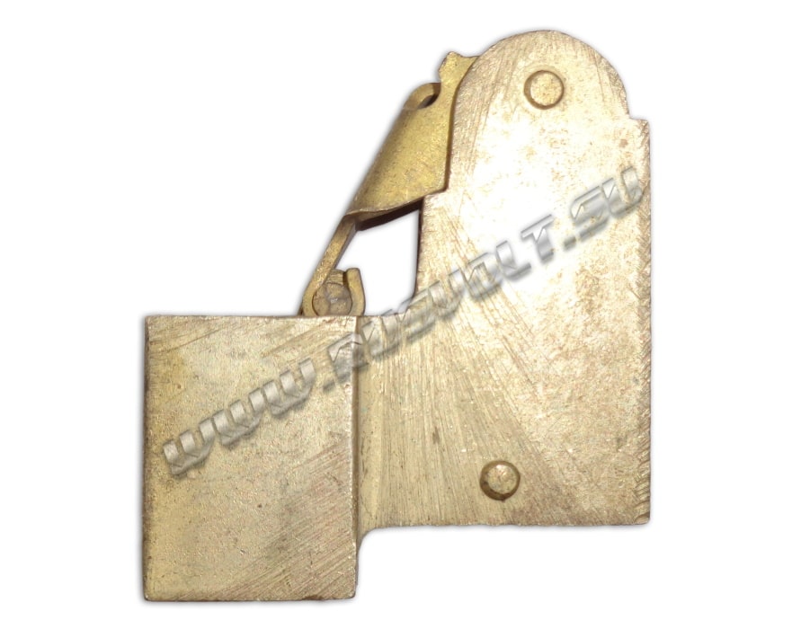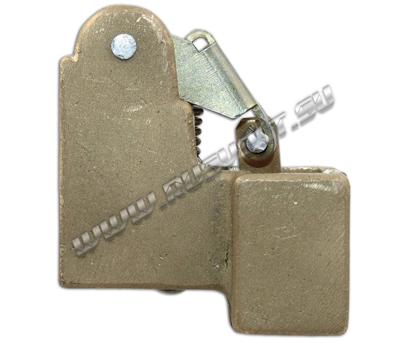 Щёткодержатель типа ДГМ 12,5х25 чертеж 5БС.112.118 или 5БС.112.118-02 со специальной нажимной цилиндрической пружиной растяжения, радиальный, с разъемом для одной щётки размером 12,5х25х40мм. Давление пружины на графитовую щётку передаётся с помощью рычага и не регулируется. Щеткодержатель крепится на круглый палец (бракет) со стороны обоймы. Изготавливается под давлением из латуни с помощью фрезерной обработки путем протяжки, сверления и запиловки.