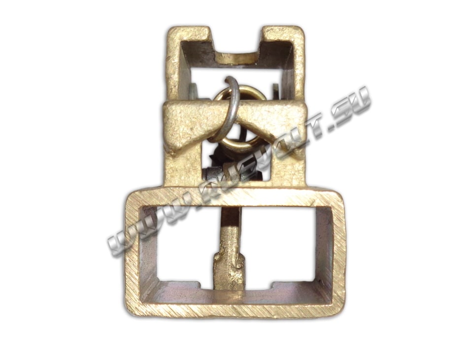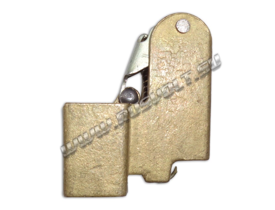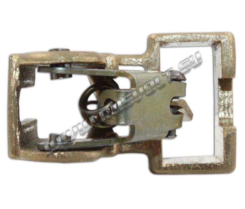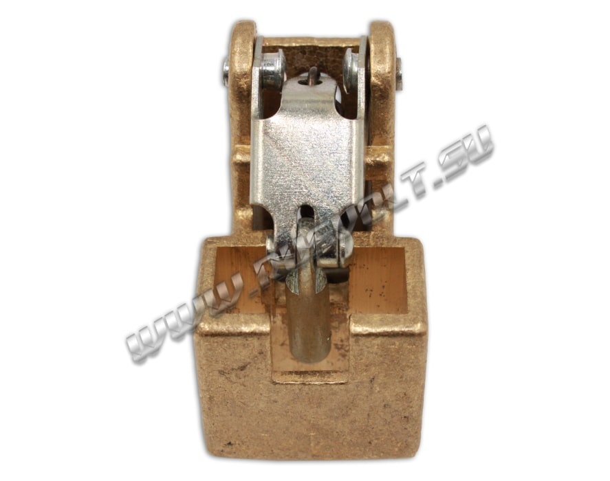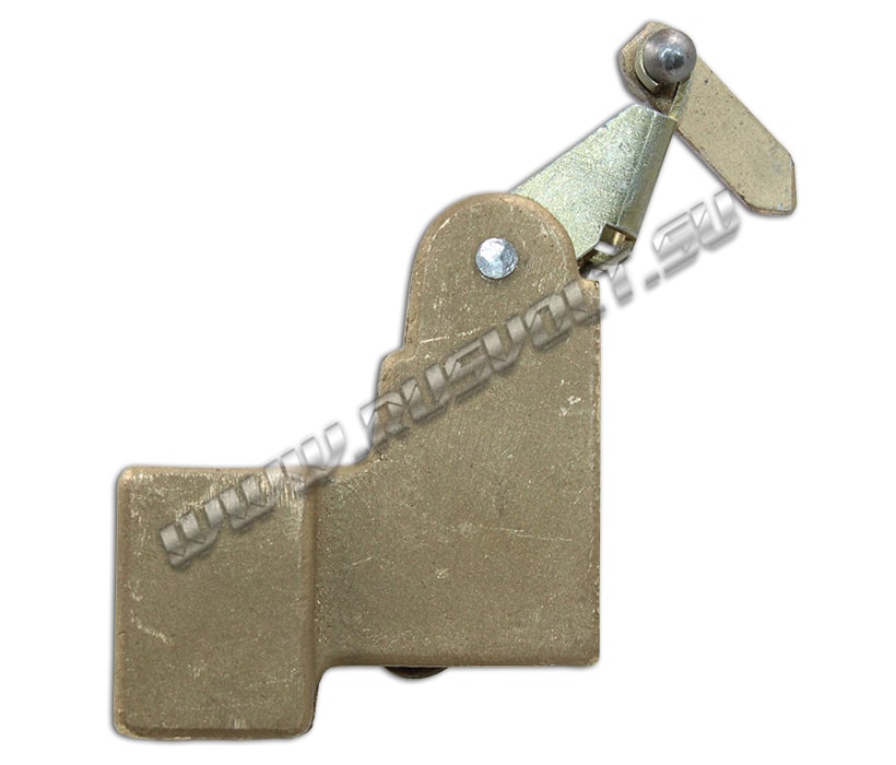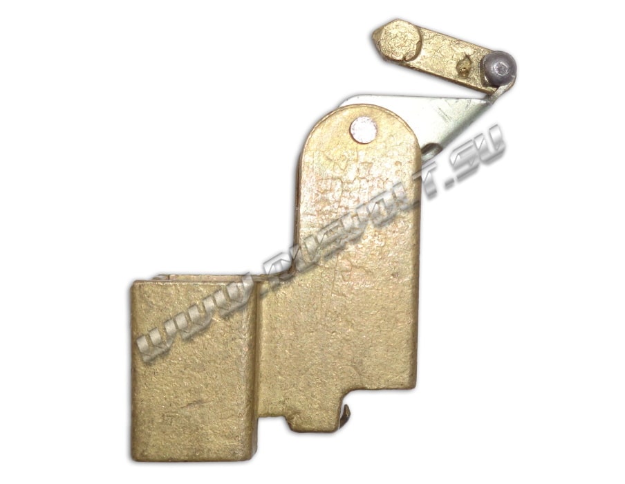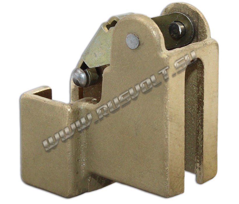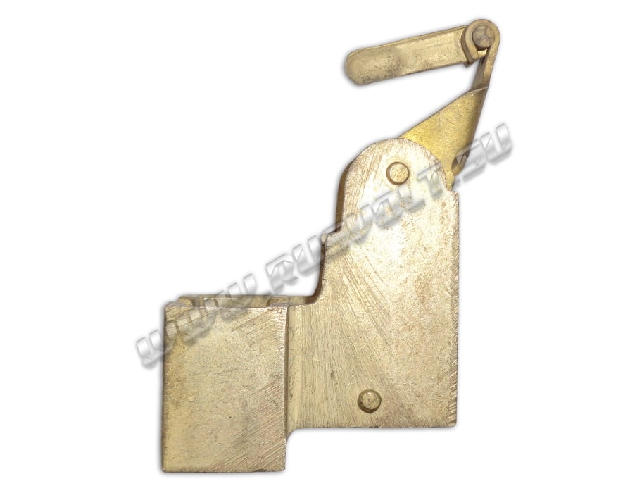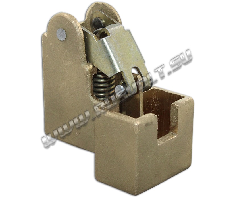 Щёткодержатель типа ДГМ 12,5х25 чертеж 5БС.112.118 или 5БС.112.118-02 со специальной нажимной цилиндрической пружиной растяжения, радиальный, с разъемом для одной щётки размером 12,5х25х40мм. Давление пружины на графитовую щётку передаётся с помощью рычага и не регулируется. Щеткодержатель крепится на круглый палец (бракет) со стороны обоймы. Изготавливается под давлением из латуни с помощью фрезерной обработки путем протяжки, сверления и запиловки.