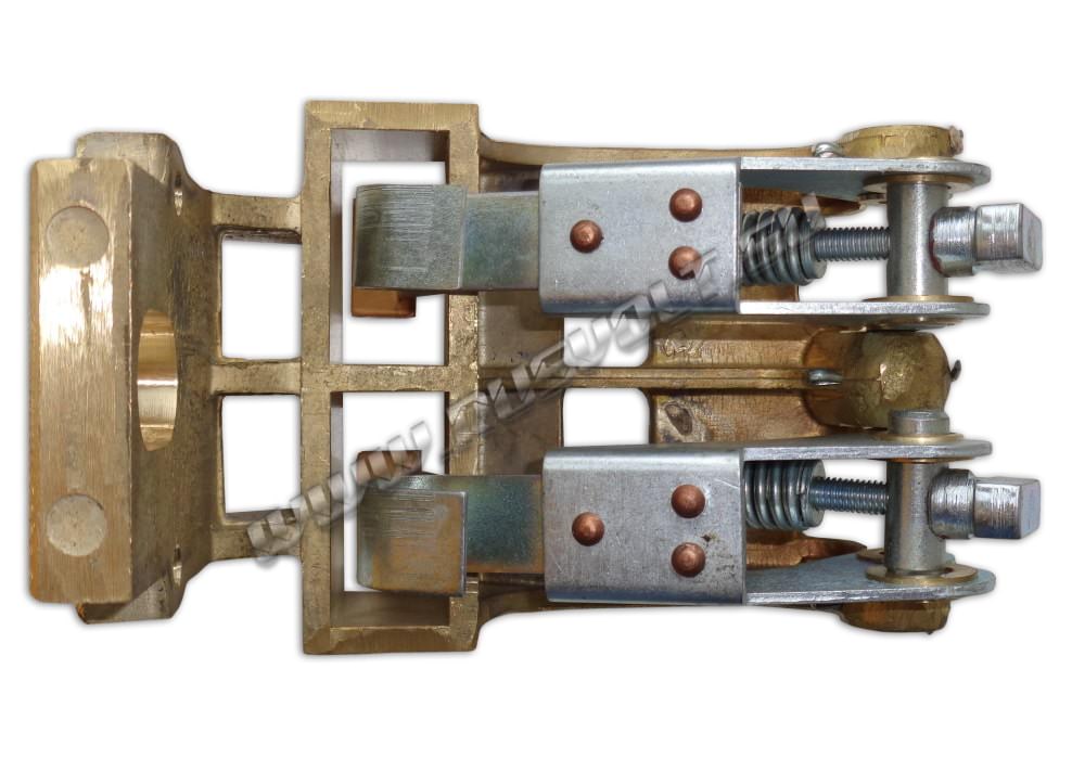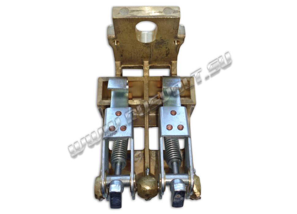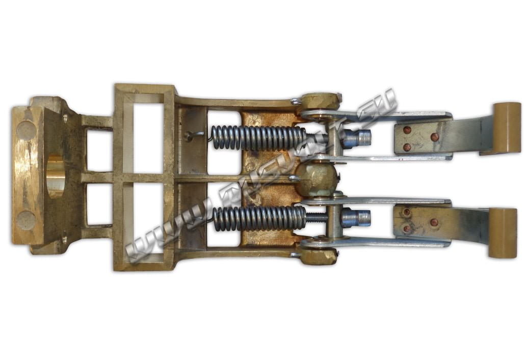 Щёткодержатель типа 1ДТ-003 2/20х40 чертеж 5ТР.112.084, 5ТР.112.086 и 8ТР.112.084.02 с витыми цилиндрическими пружинами растяжения, радиальный, с разъемами для двух щеток. Давление пружин на графитовые электрощётки регулируемое и передаётся с помощью рычага. Щеткодержатель крепится на палец (бракет) со стороны обоймы. Изготавливается под давлением из латуни с помощью фрезерной обработки путем протяжки, сверления и запиловки.