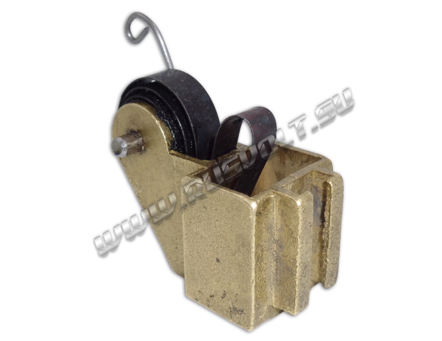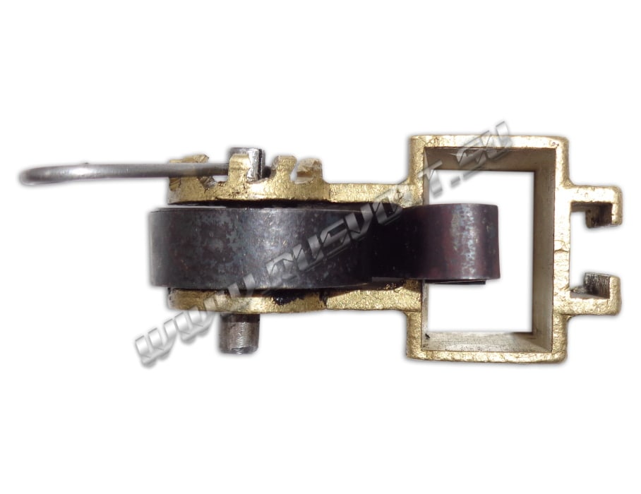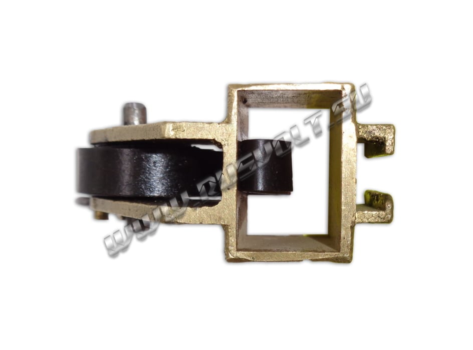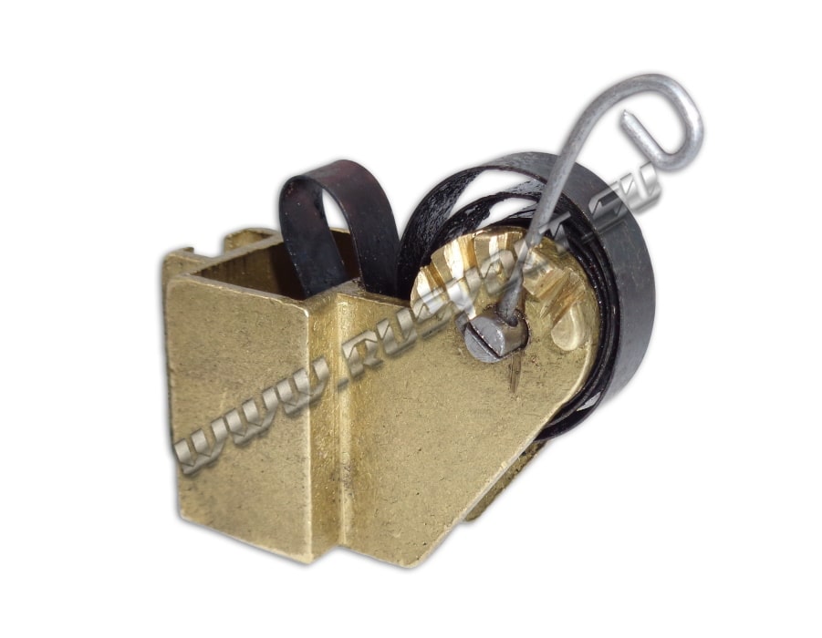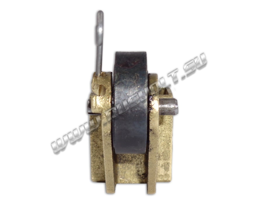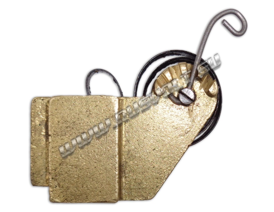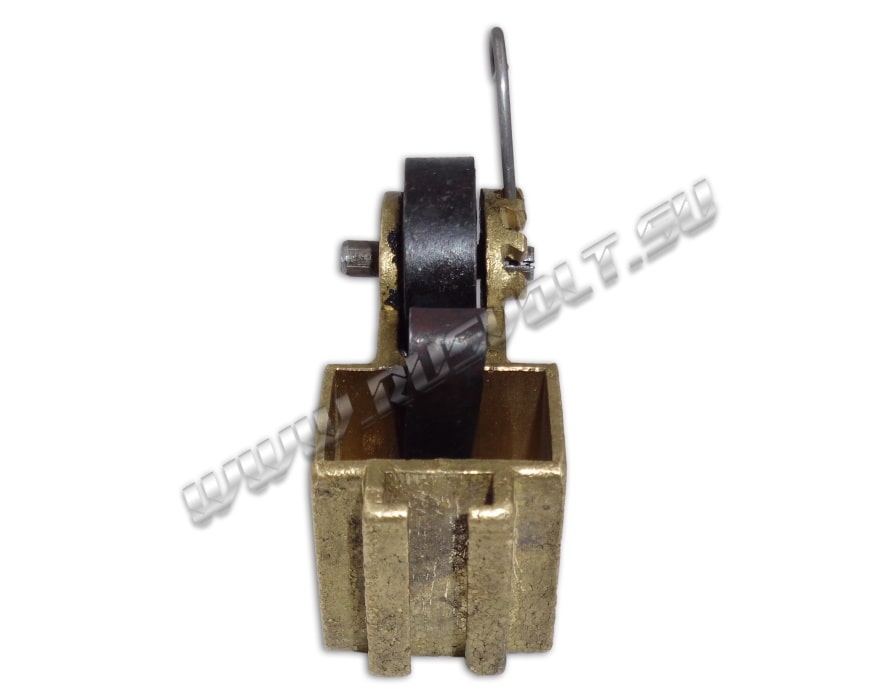 Щёткодержатель типа ДТ-701-706 16х25 чертеж Т463.61.92.00 со спиральной пружиной часового типа и разъемом для одной щетки. Давление пружины на графитовую электрощётку регулируется и передаётся с помощью рычага. Щеткодержатель крепится на палец (бракет). Изготавливается под давлением из латуни с помощью фрезерной обработки путем протяжки, сверления и запиловки.