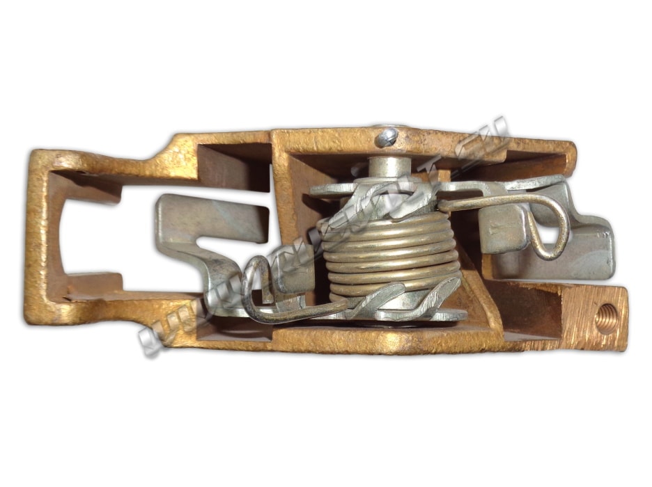 Щёткодержатель типа ДТнПк2 12,5х32 чертеж 5ТХ.112.013 это тандем-щеткодержатель с цилиндрической нажимной пружиной кручения и обоймами для двух щёток размером 12,5х32х64мм. Давление пружины на графитовую щётку передаётся с помощью рычага и регулируется. Щеткодержатель крепится на палец (бракет) со стороны обоймы. Изготавливается под давлением из латуни с помощью фрезерной обработки путем протяжки, сверления и запиловки. Они бывают несимметричными и симметричными. В несимметричных ДТнПк 2/12,5*32 углы наклона оси его обоймы 30 и 10 градусов, а в симметричных 20 и 20 градусов.