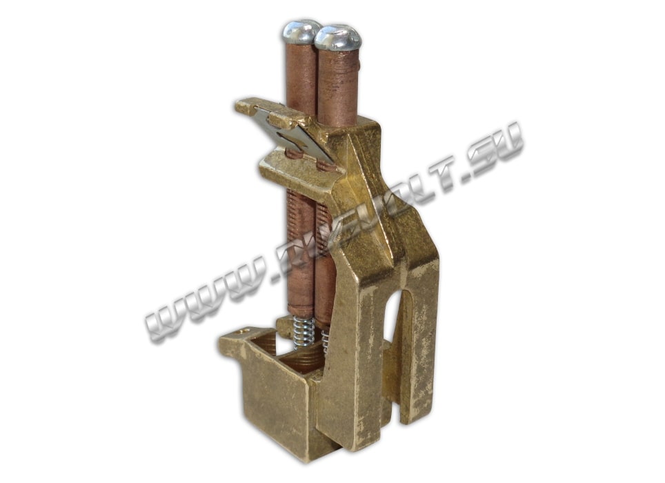 Щёткодержатель ДТрПс2 12,5х32 (чертеж 5БХ.112.032) со специальными цилиндрическими пружинами сжатия, тандем радиальный, с разъемами для двух щёток размером 12,5х32. Давление пружин на графитовые щётки регулируется ступенчато и передаётся непосредственно пружинами. Щеткодержатель крепится на палец (бракет). Изготавливается при помощи латунного литья, с последующей фрезерной обработкой путем протяжки, сверления и запиловки.