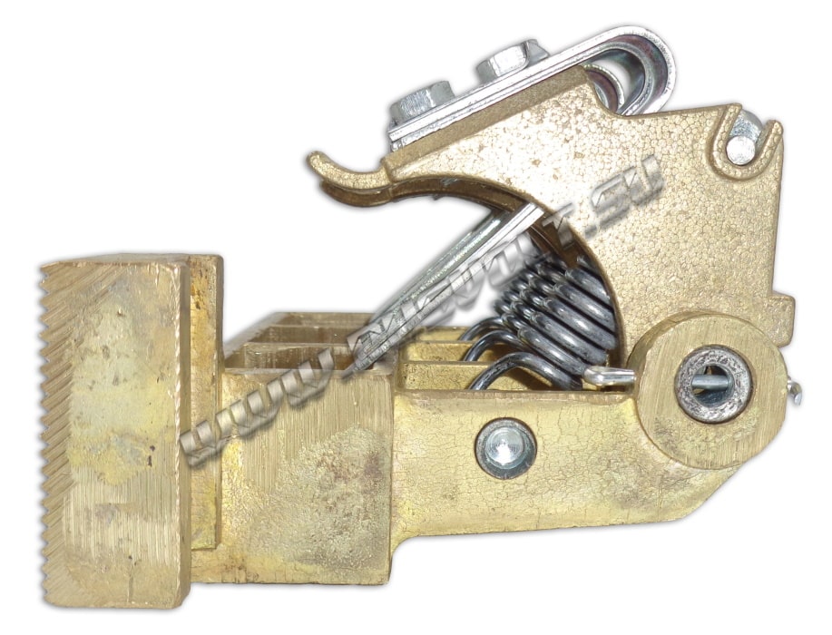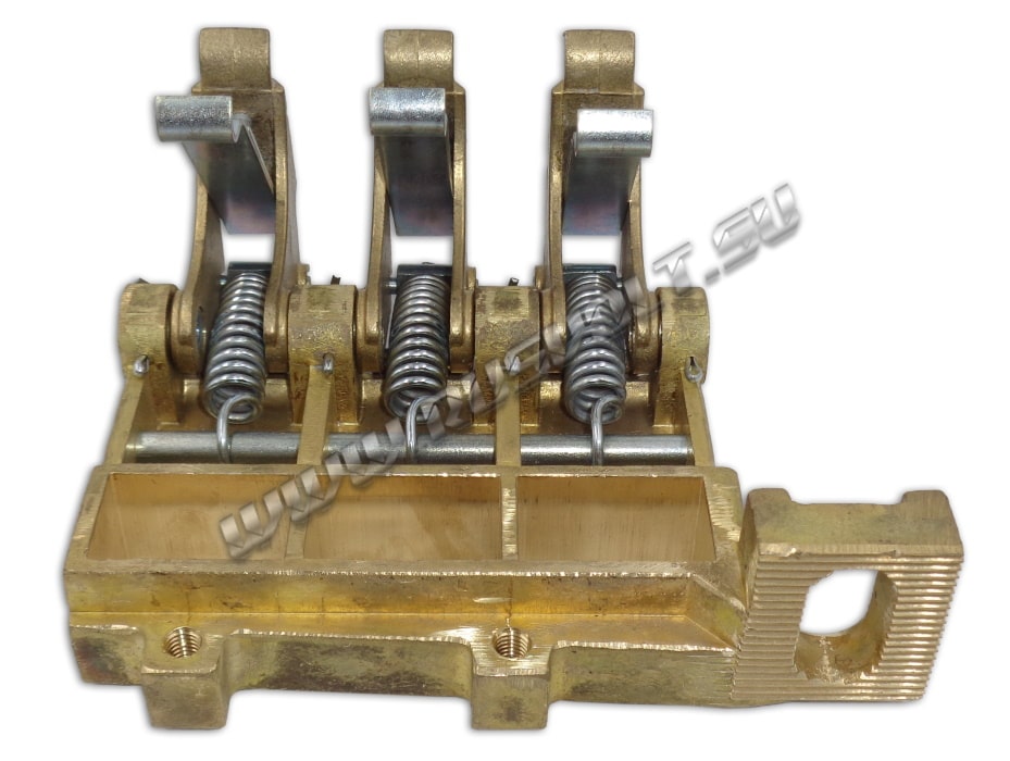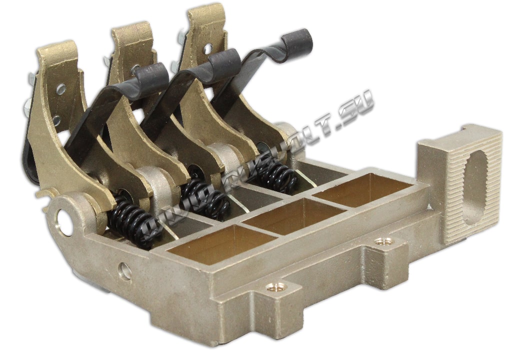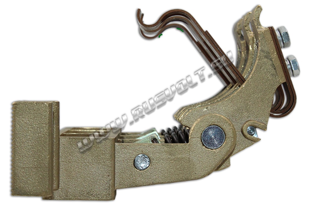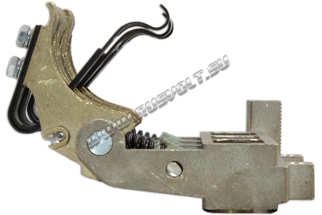 Щеткодержатель типа ЭК-590 25х40 чертеж ДИЖЦ.685122.001 (левый) со специальной нажимной цилиндрической пружиной растяжения, радиальный, с разъемом для трех щеток. Давление пружины на графитовую щётку регулируется и передаётся с помощью рычага. Щеткодержатель крепится на круглый палец (бракет) со стороны обоймы. Изготавливается под давлением из латуни с помощью фрезерной обработки путем протяжки, сверления и запиловки.