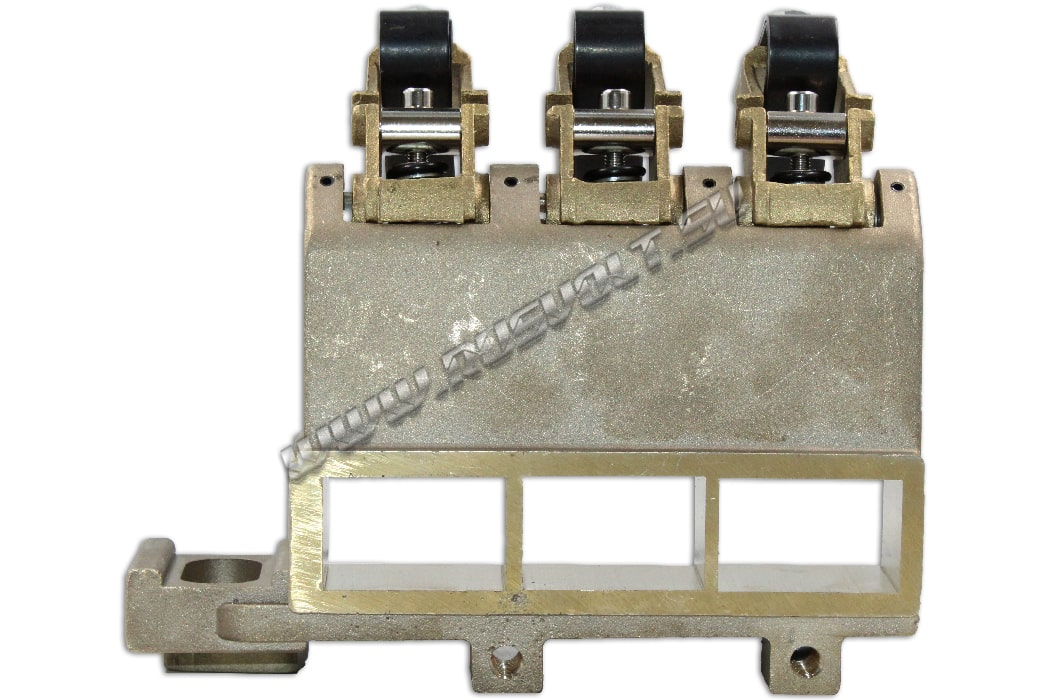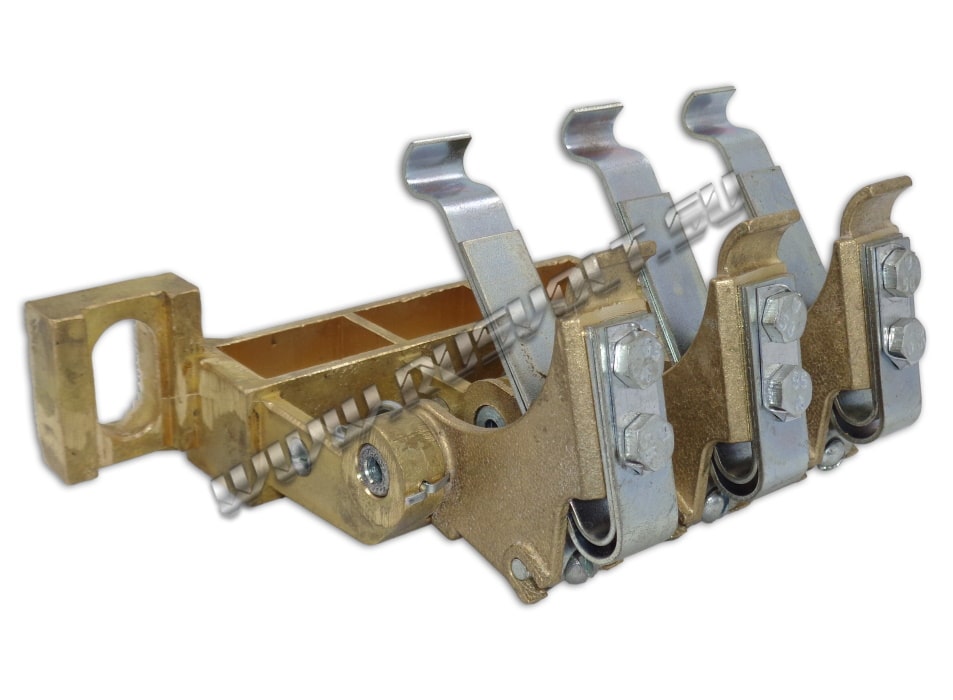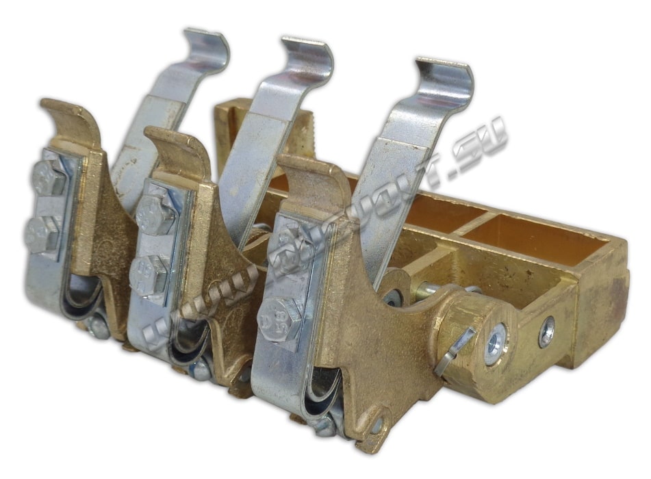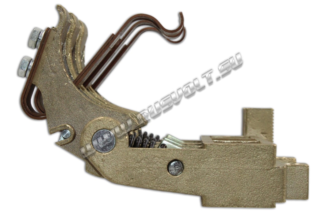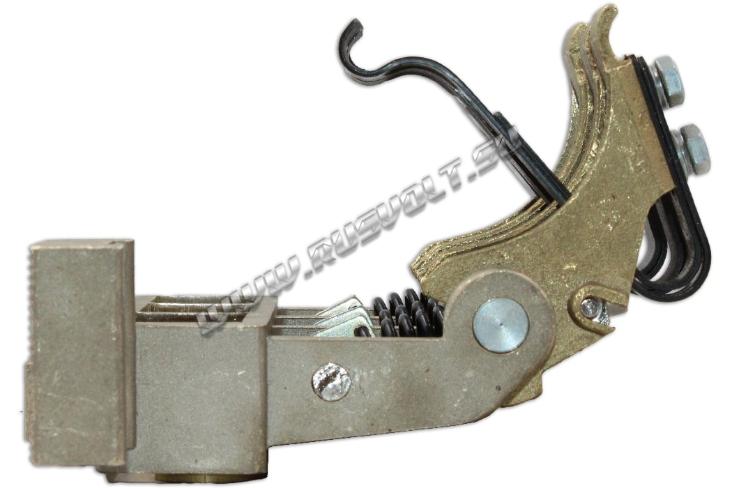 Щеткодержатель типа ЭК-590 25х40 чертеж ДИЖЦ.685122.001 (левый) со специальной нажимной цилиндрической пружиной растяжения, радиальный, с разъемом для трех щеток. Давление пружины на графитовую щётку регулируется и передаётся с помощью рычага. Щеткодержатель крепится на круглый палец (бракет) со стороны обоймы. Изготавливается под давлением из латуни с помощью фрезерной обработки путем протяжки, сверления и запиловки.