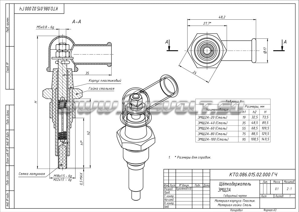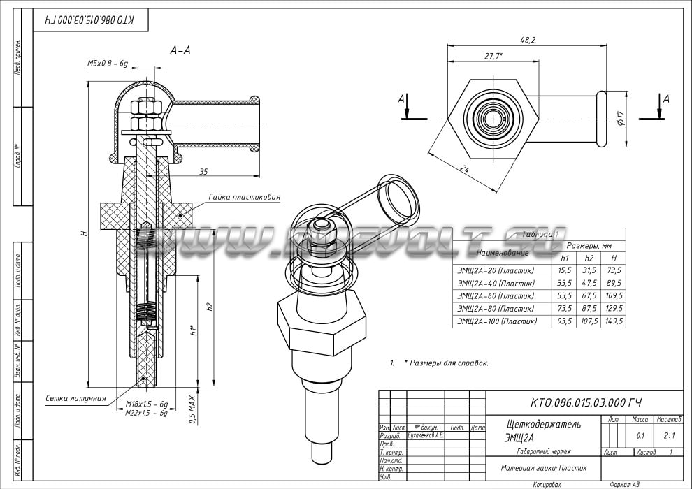 Размеры щеткодержателей типа ЭМЩ-2А (пластиковый корпус) и ЗИП для них