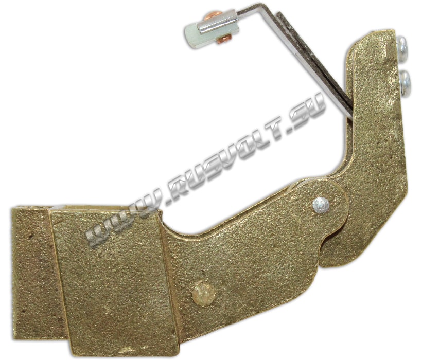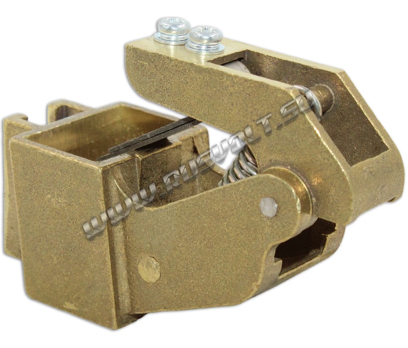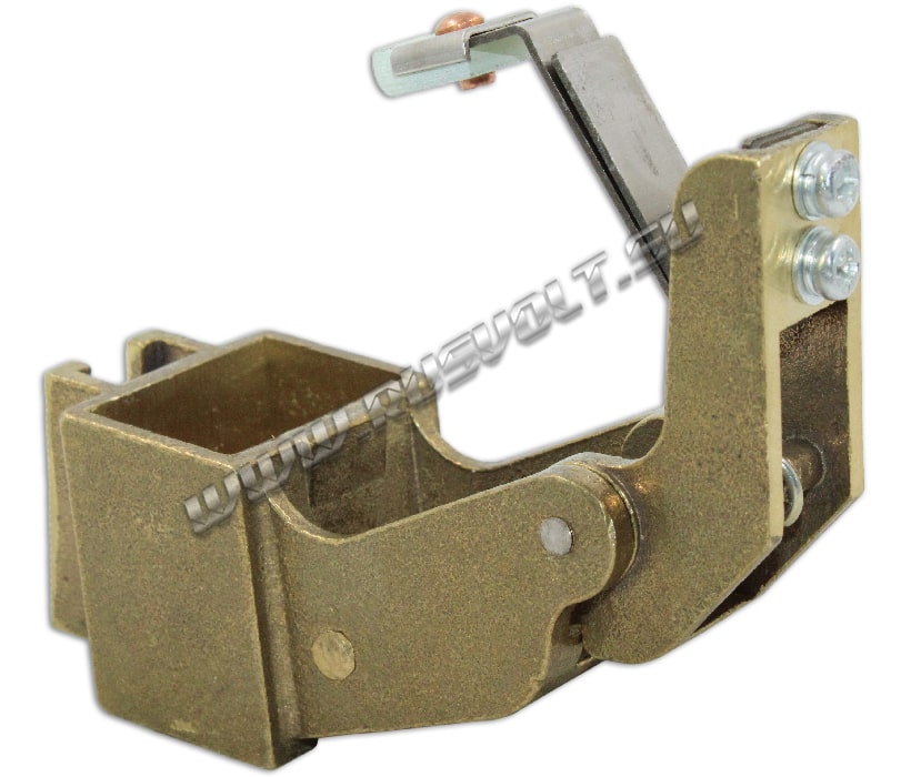 Щёткодержатель BNE-RV 20х32 (возможные аналоги Schunk и Mersen (Carbon Lorraine)) состоит из одной обоймы с углом скоса для электрощетки и нажимного устройства, обеспечивающего прилегание щеток к токосъемным кольцам с необходимым усилием. В нем используются импортные щетки и давление на них передаётся при помощи рычага с цилиндрической пружиной растяжения, наконечник рычага изготовлен из текстолита. Сам щеткодержатель крепится на бракет (траверсу). Готовый узел токосъема устанавливается на блоке контактных колец. Изготавливается под давлением из латуни или стали с помощью фрезерной обработки путем протяжки, сверления и запиловки.
