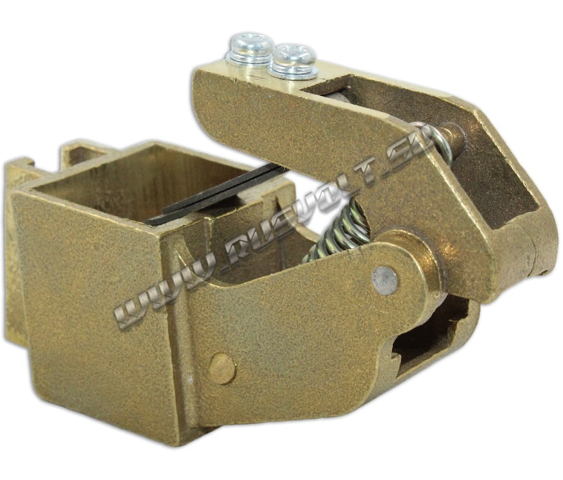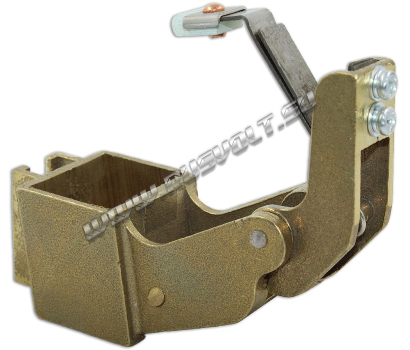 Щёткодержатель BNE-RV 25х32 (возможные аналоги Schunk и Mersen (Carbon Lorraine)) состоит из одной обоймы с углом скоса для электрощетки и нажимного устройства, обеспечивающего прилегание щеток к токосъемным кольцам с необходимым усилием. В нем используются импортные щетки и давление на них передаётся при помощи рычага с цилиндрической пружиной растяжения, наконечник рычага изготовлен из текстолита. Сам щеткодержатель крепится на бракет (траверсу). Готовый узел токосъема устанавливается на блоке контактных колец. Изготавливается под давлением из латуни или стали с помощью фрезерной обработки путем протяжки, сверления и запиловки.