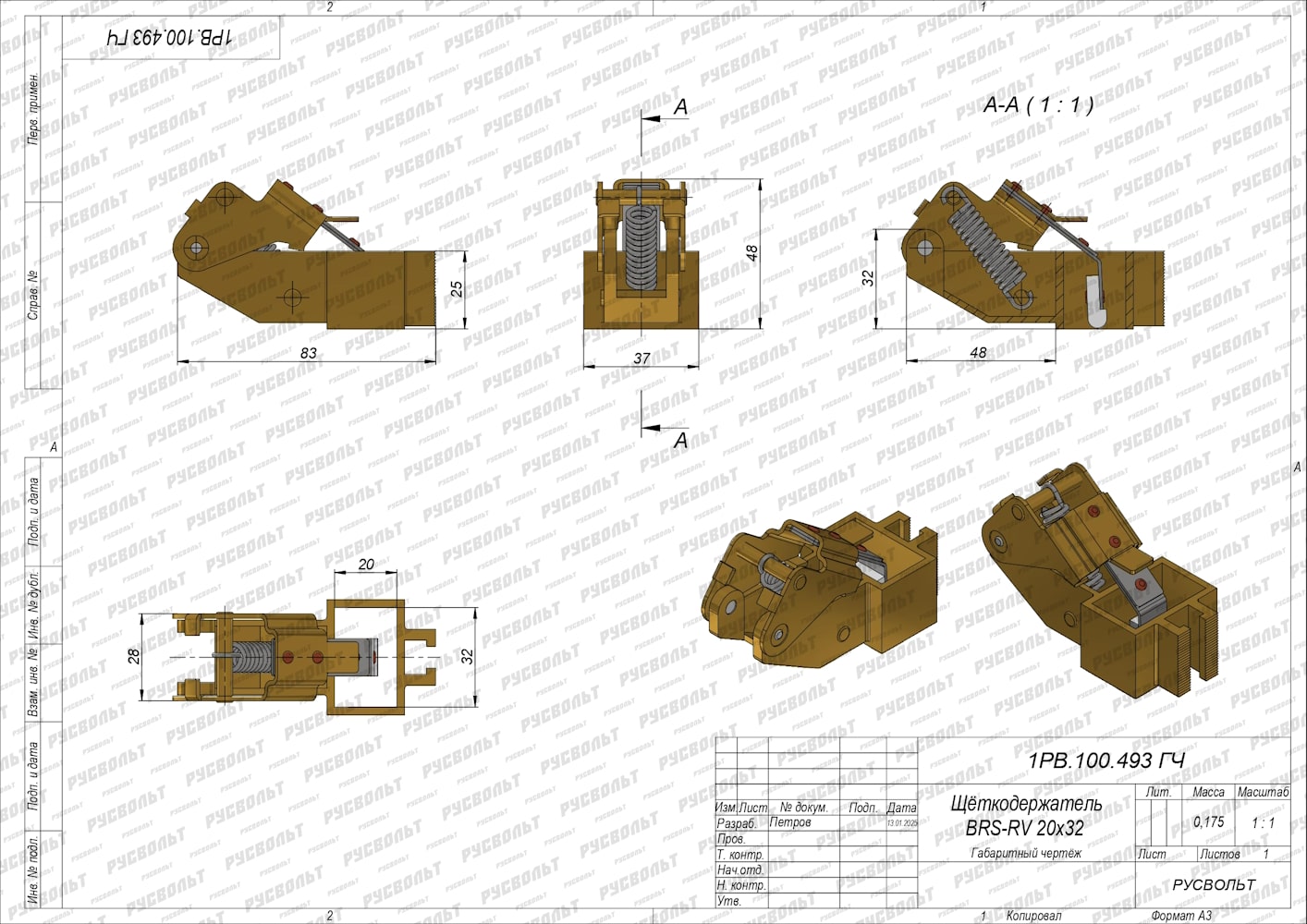 Щеткодержатель BRS-RV 20х32 (аналог Schunk, Mersen, Carbone Lorraine, Siemens, Pantrac, Lampar, Rekofa) - чертеж 1РВ.100.493 ГЧ
