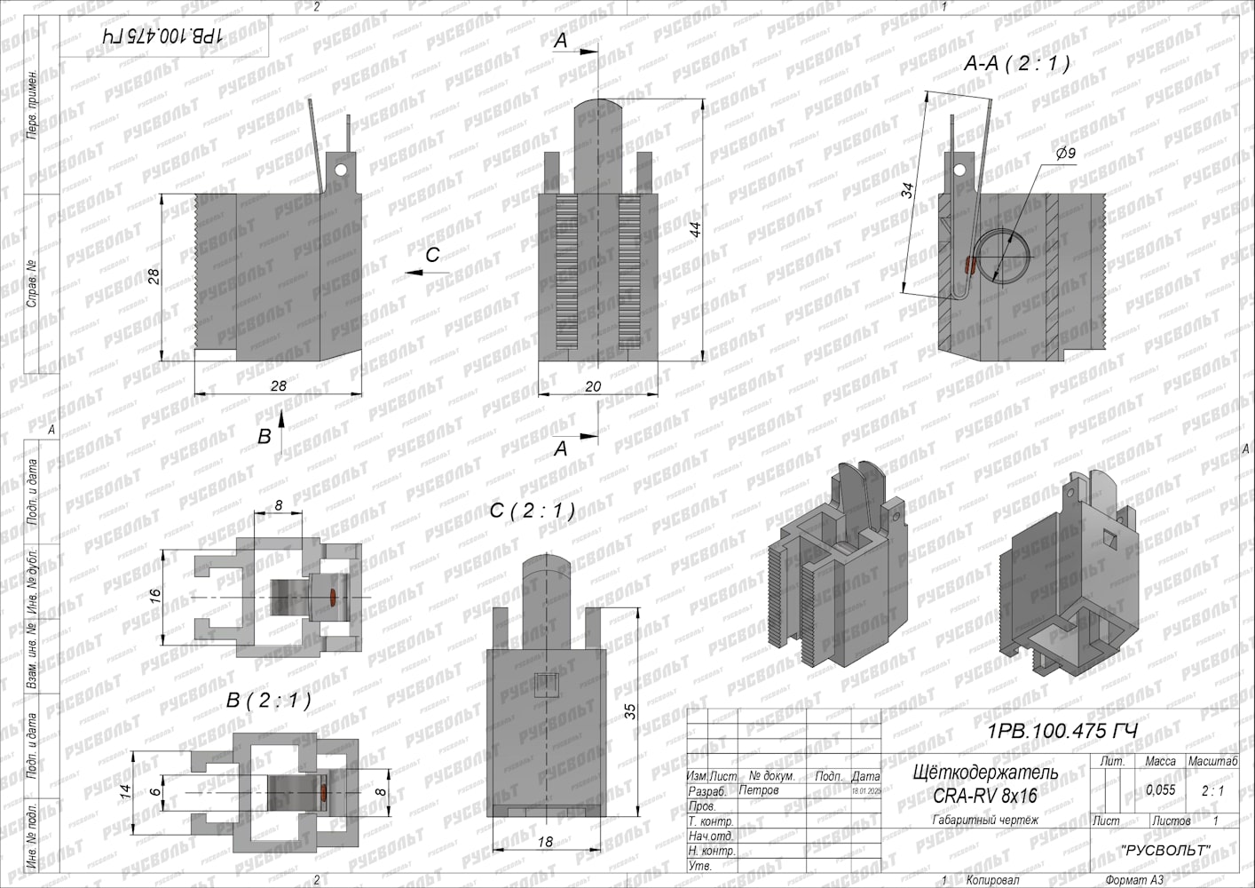 Щеткодержатель CRA-RV 8x16 (никелированный) - чертеж 1РВ.100.475 ГЧ