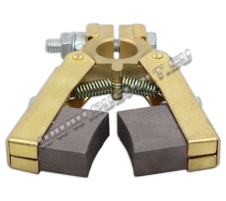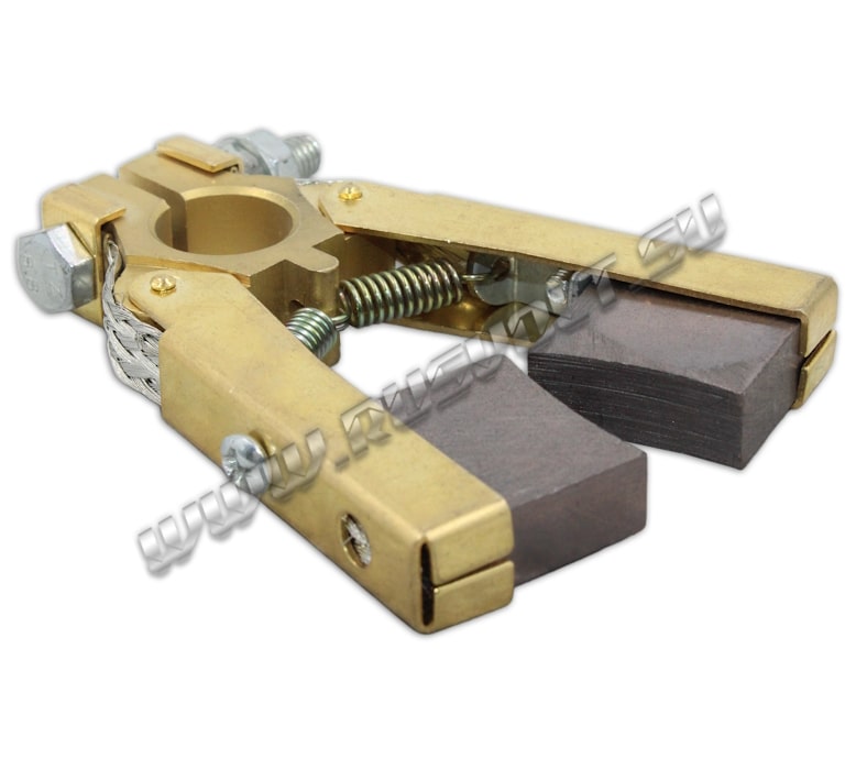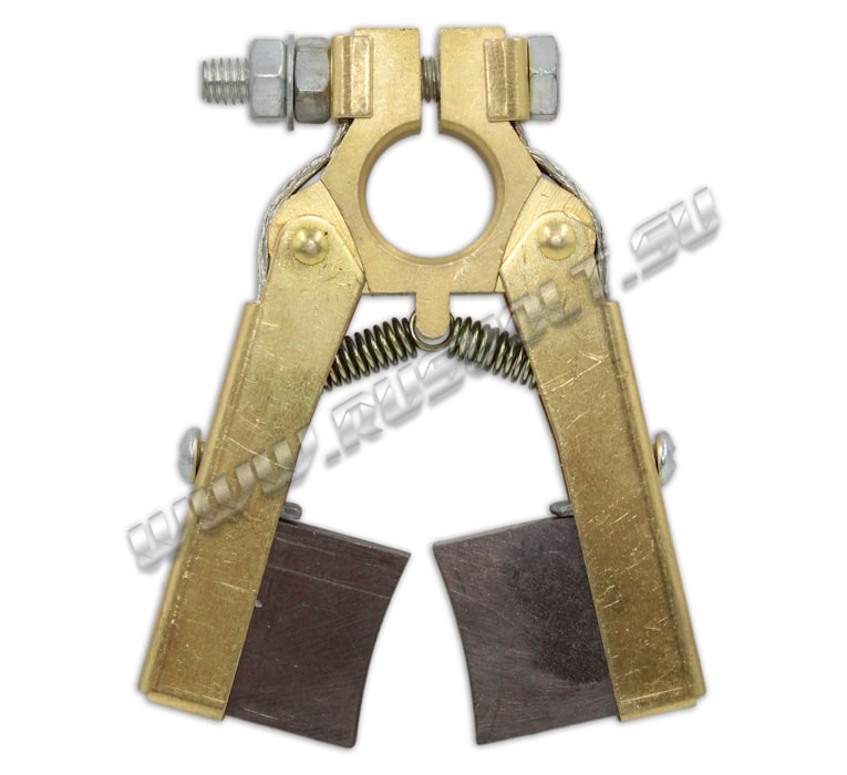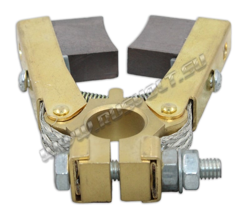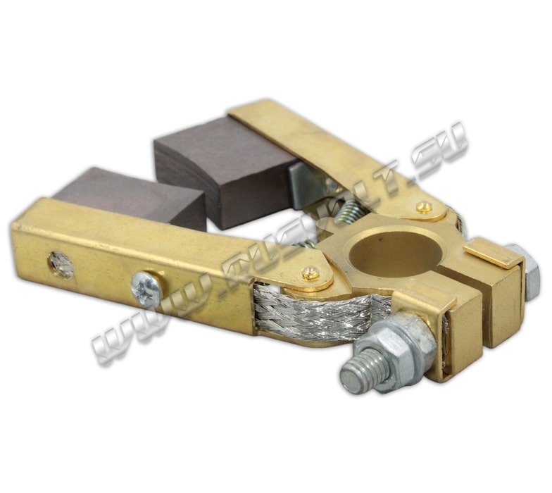 Щёткодержатели DDo-RV 10х25 d=16 мм, L=55 мм используются в электрических машинах с блоками контактных колец. Диаметр отверстия под бракет 16 мм, длина от центра электрощетки до центра отверстия под бракет 55 мм. Сделан методом штамповки из листовой латуни и состоит из двух обойм для электрощеток, медных гибких шинопроводов из тонких медных проволок по которым осуществляется прохождение тока между электрощетками и зажимом. Давление пружин на графитовые щётки передаётся при помощи цилиндрических пружин растяжения и не регулируется. Сам щеткодержатель крепится на круглый бракет (траверсу) и устанавливается на оси токосъемного кольца. В комплекте на выбор идут две меднографитовые электрощетки J164 10х25 мм - более твердые, либо J204 10х25 мм - более мягкие.