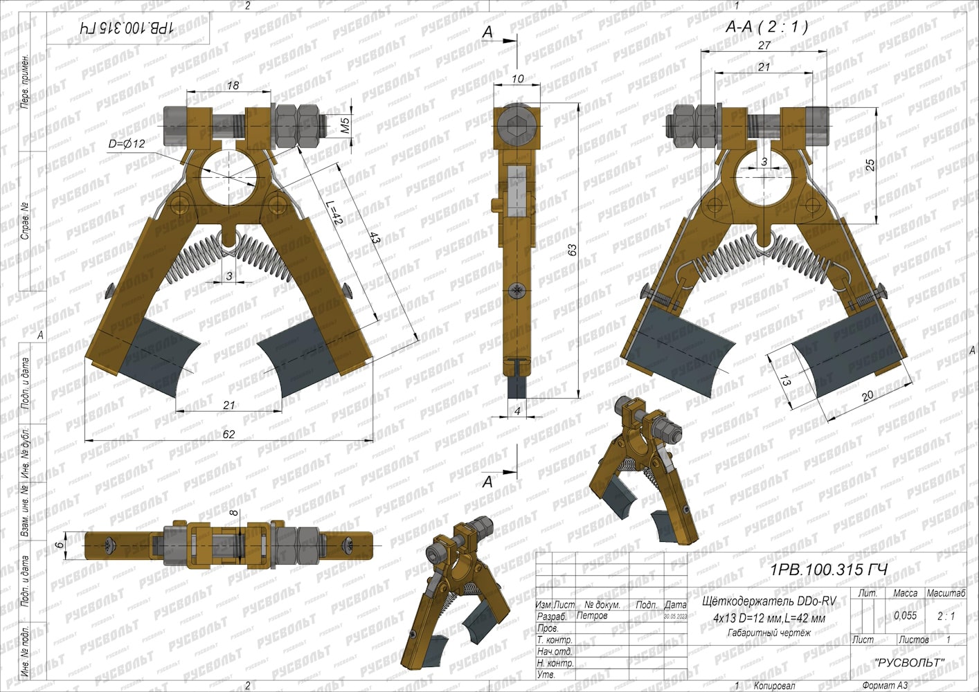 Щеткодержатель DDo-RV 4х13 d=12 мм, L=42 мм (аналог Schunk, Mersen, Carbone Lorraine, Siemens, Pantrac, Lampar, Rekofa) - чертеж 1РВ.100.315 ГЧ