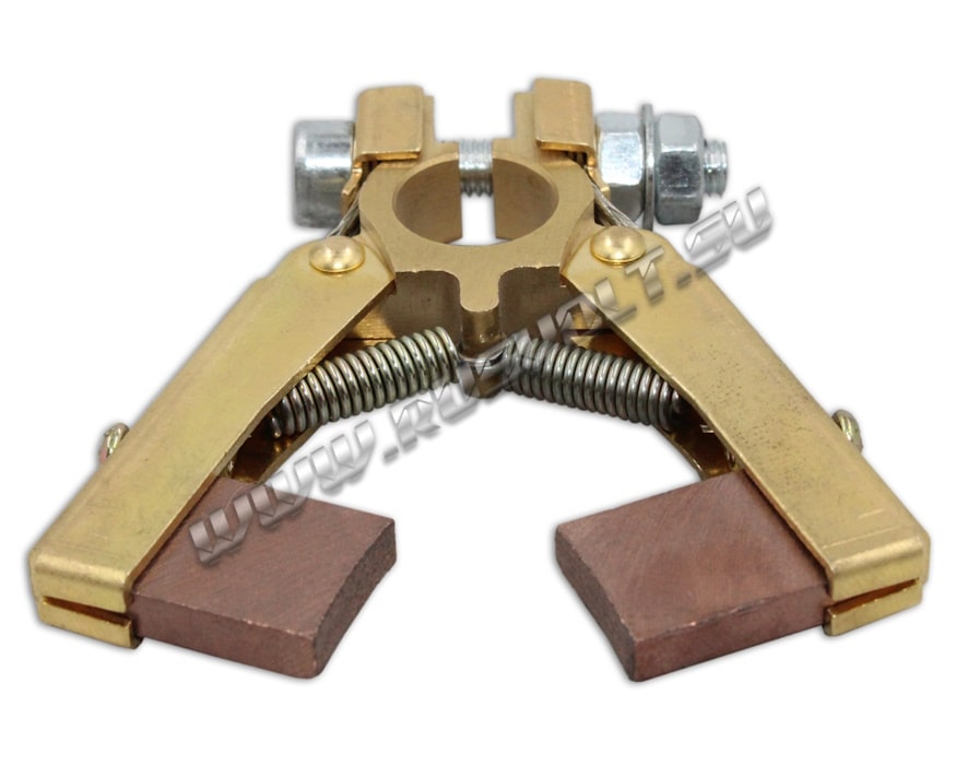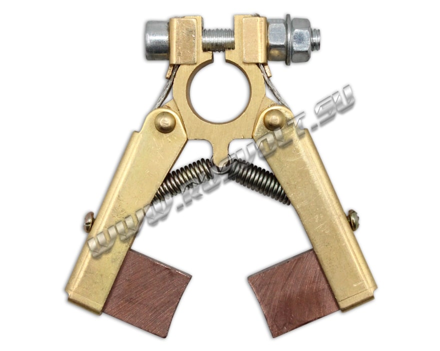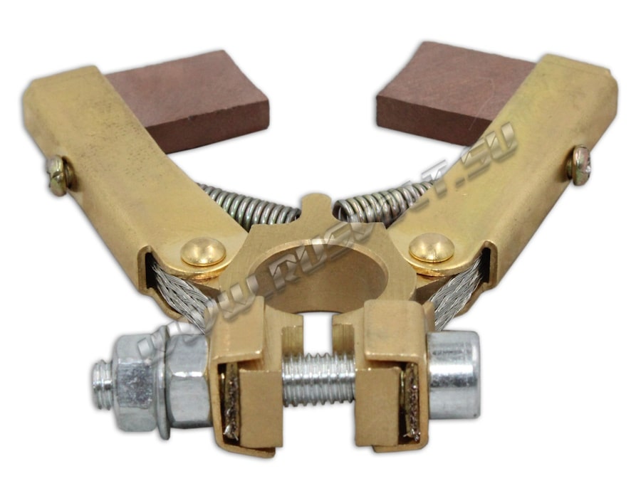 Щёткодержатели DDo-RV 4х13 d=12 мм, L=42 мм используются в электрических машинах с блоками контактных колец. Диаметр отверстия под бракет 12 мм, длина от центра электрощетки до центра отверстия под бракет 42 мм. Сделан методом штамповки из листовой латуни и состоит из двух обойм для электрощеток, медных гибких шинопроводов из тонких медных проволок по которым осуществляется прохождение тока между электрощетками и зажимом. Давление пружин на графитовые щётки передаётся при помощи цилиндрических пружин растяжения и не регулируется. Сам щеткодержатель крепится на круглый бракет (траверсу) и устанавливается на оси токосъемного кольца. В комплекте на выбор идут две меднографитовые электрощетки J164 4х13 мм - более твердые, либо J204 4х13 мм - более мягкие.