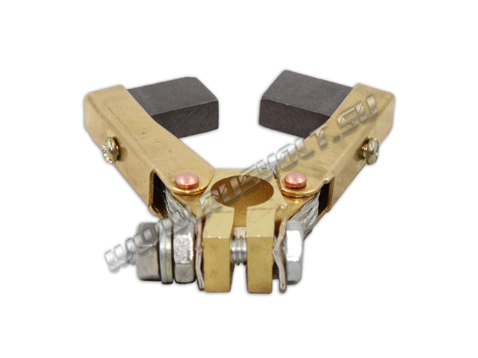 Щёткодержатели DDo-RV 5х9 d=8 мм, L=30 мм (возможный аналог DDo 105-36 5х9 Mersen (Carbon Lorraine)) используются в электрических машинах с блоками контактных колец. Диаметр отверстия под бракет 8 мм, длина от центра электрощетки до центра отверстия под бракет 30 мм. Сделан методом штамповки из листовой латуни и состоит из двух обойм для электрощеток, медных гибких шинопроводов из тонких медных проволок по которым осуществляется прохождение тока между электрощетками и зажимом. Давление пружин на графитовые щётки передаётся при помощи цилиндрических пружин растяжения и не регулируется. Сам щеткодержатель крепится на круглый бракет (траверсу) и устанавливается на оси токосъемного кольца. В комплекте на выбор идут две меднографитовые электрощетки J164 5х9 мм - более твердые, либо J204 5х9 мм - более мягкие.