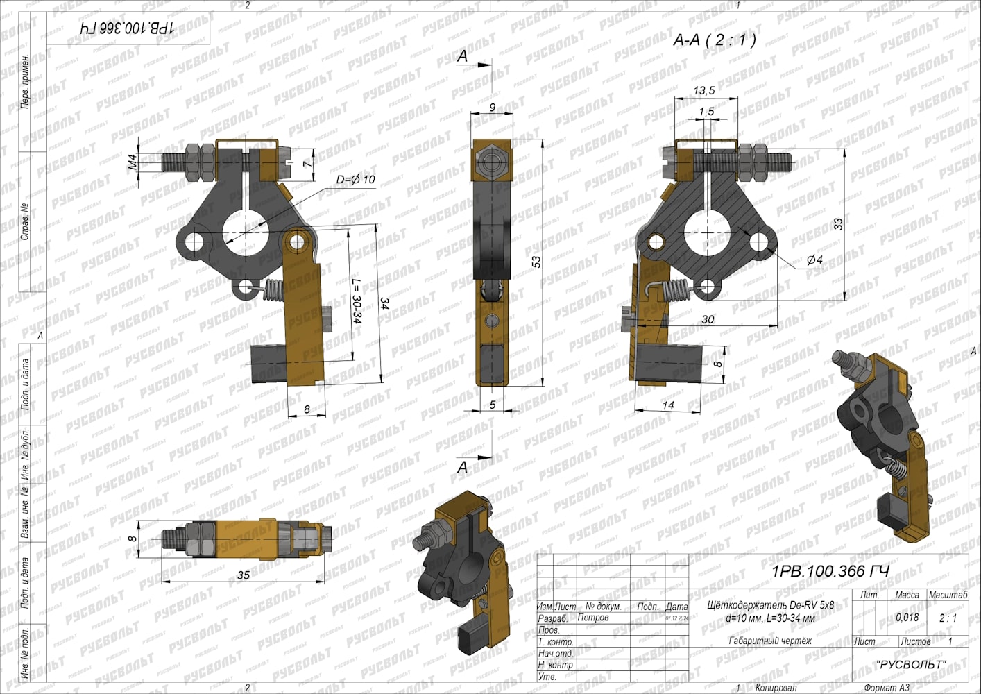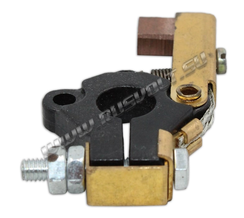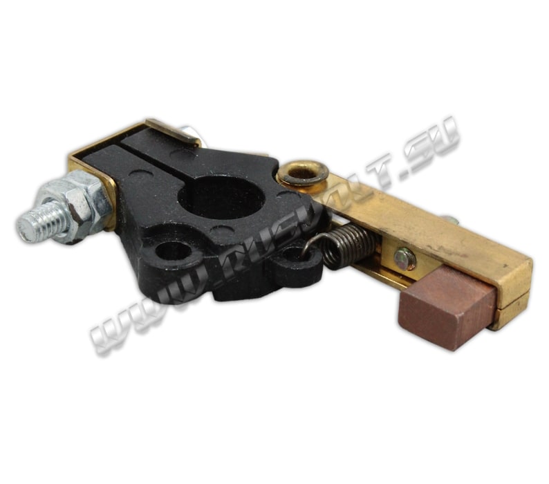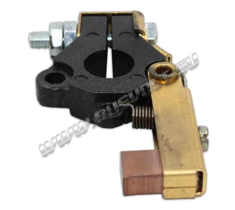 Щёткодержатели De-RV 5x8 d=10 мм, L=30 мм используются в электрических машинах в узлах токосъема с блоками контактных колец. Диаметр отверстия под бракет 10 мм, длина от центра электрощетки до центра отверстия под бракет 30 мм. Сделан методом штамповки из листовой латуни и состоит из одной обоймы для электрощетки, медного гибкого шинопровода с лужением из тонких медных проволок по которым осуществляется прохождение тока между электрощеткой и зажимом. Давление пружины на графитовую щётку передаётся при помощи цилиндрической пружины растяжения и не регулируется. Сам щеткодержатель крепится на круглый бракет (траверсу) и устанавливается на оси токосъемного кольца. В комплекте на выбор идет меднографитовая электрощетка J164 5x8 мм - более твердая, либо J204 5x8 мм - более мягкая.