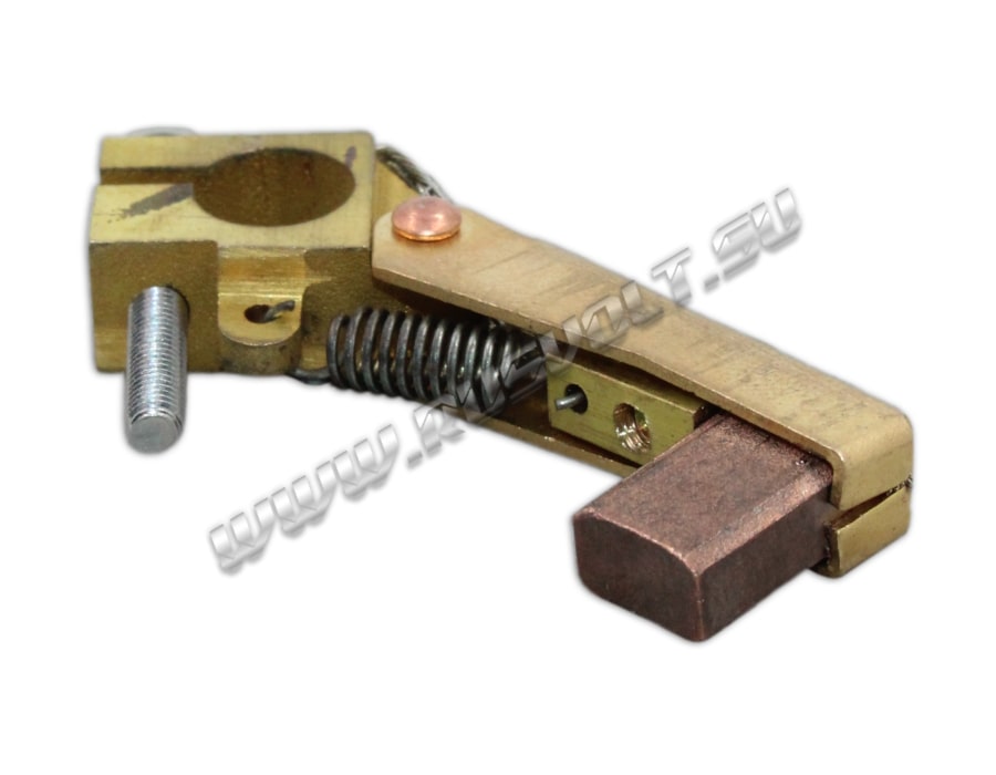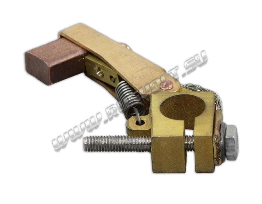 Щёткодержатели De-RV 5x8 d=8 мм, L=32 мм используются в электрических машинах в узлах токосъема с блоками контактных колец. Диаметр отверстия под бракет 8 мм, длина от центра электрощетки до центра отверстия под бракет 32 мм. Сделан методом штамповки из листовой латуни и состоит из одной обоймы для электрощетки, медного гибкого шинопровода с лужением из тонких медных проволок по которым осуществляется прохождение тока между электрощеткой и зажимом. Давление пружины на графитовую щётку передаётся при помощи цилиндрической пружины растяжения и не регулируется. Сам щеткодержатель крепится на круглый бракет (траверсу) и устанавливается на оси токосъемного кольца. В комплекте на выбор идет меднографитовая электрощетка J164 5x8 мм - более твердая, либо J204 5x8 мм - более мягкая.