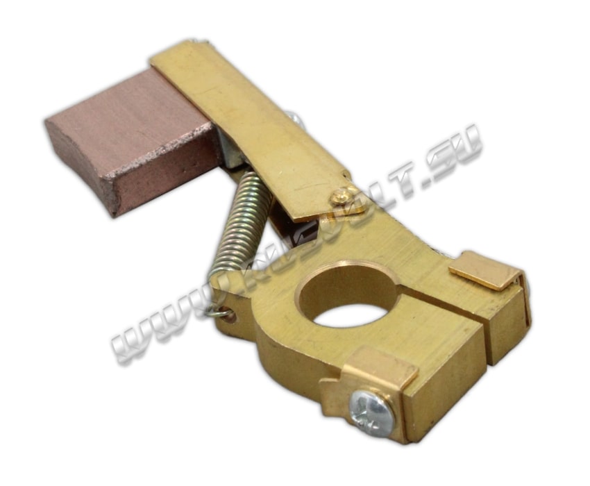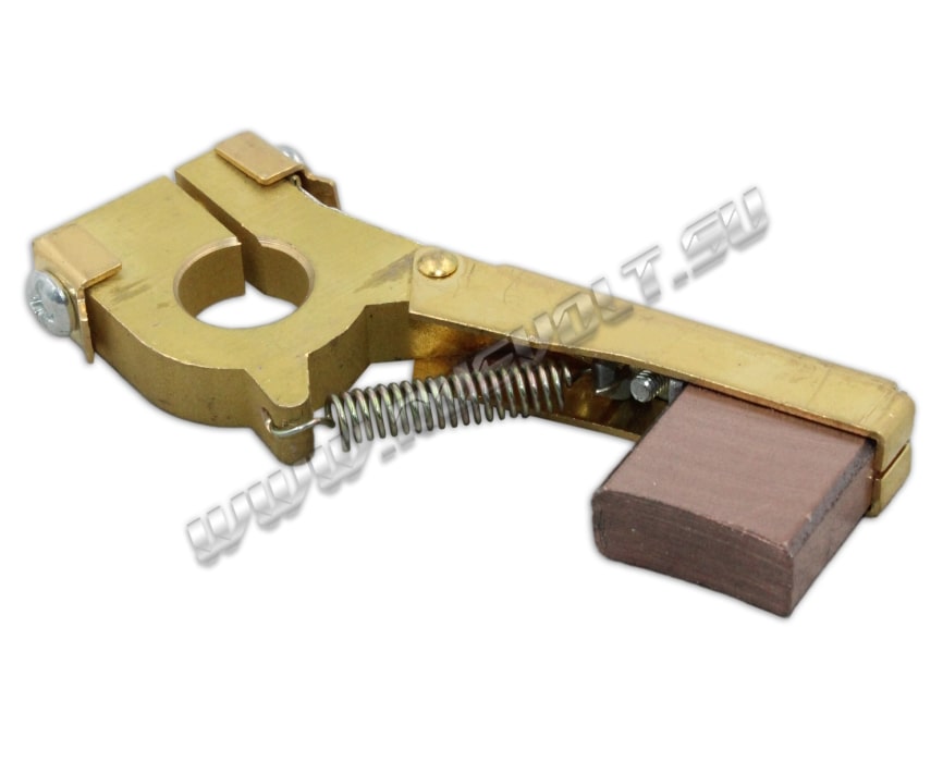 Щёткодержатели De-RV 8x20 d=13 мм, L=56 мм используются в электрических машинах в узлах токосъема с блоками контактных колец. Диаметр отверстия под бракет 13 мм, длина от центра электрощетки до центра отверстия под бракет 56 мм. Сделан методом штамповки из листовой латуни и состоит из одной обоймы для электрощетки, медного гибкого шинопровода с лужением из тонких медных проволок по которым осуществляется прохождение тока между электрощеткой и зажимом. Давление пружины на графитовую щётку передаётся при помощи цилиндрической пружины растяжения и не регулируется. Сам щеткодержатель крепится на круглый бракет (траверсу) и устанавливается на оси токосъемного кольца. В комплекте на выбор идет меднографитовая электрощетка J164 8x20 мм - более твердая, либо J204 8x20 мм - более мягкая.