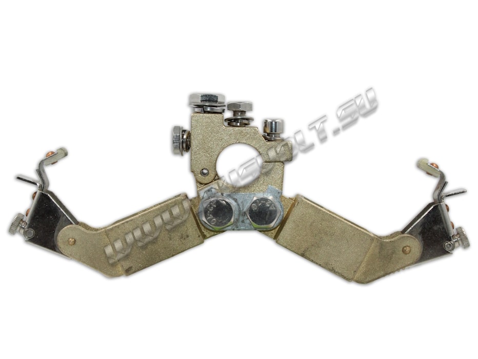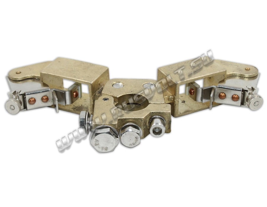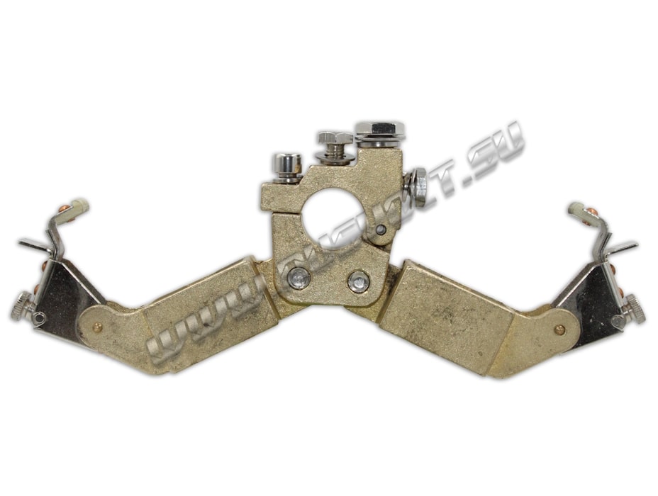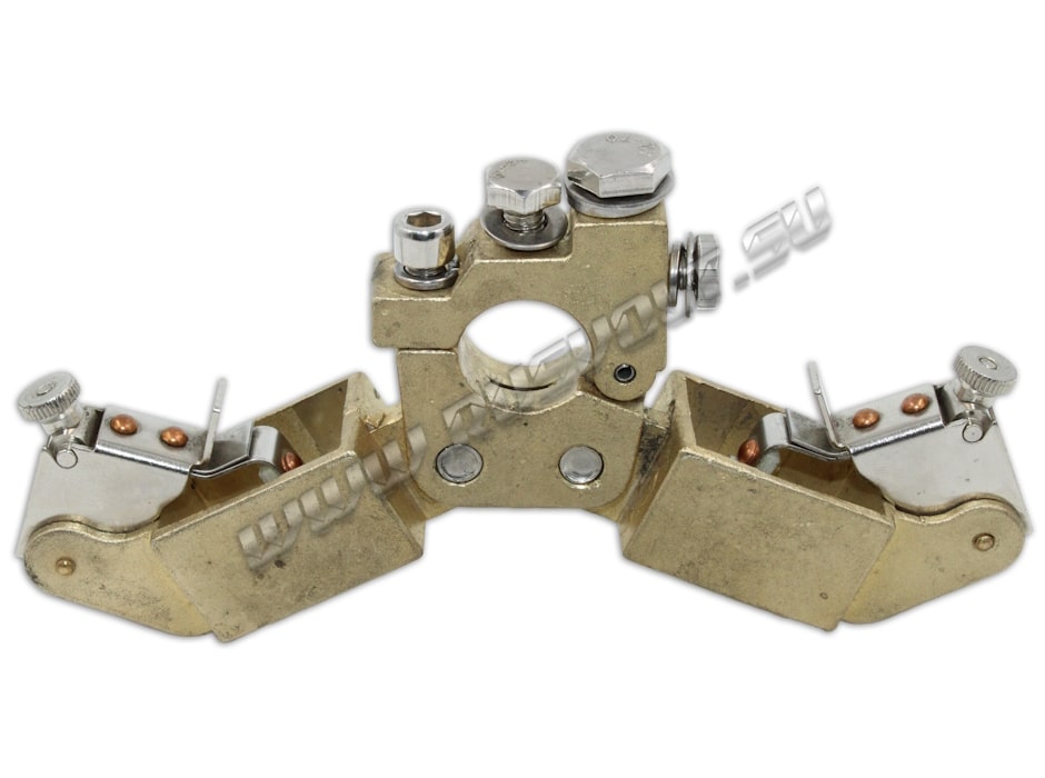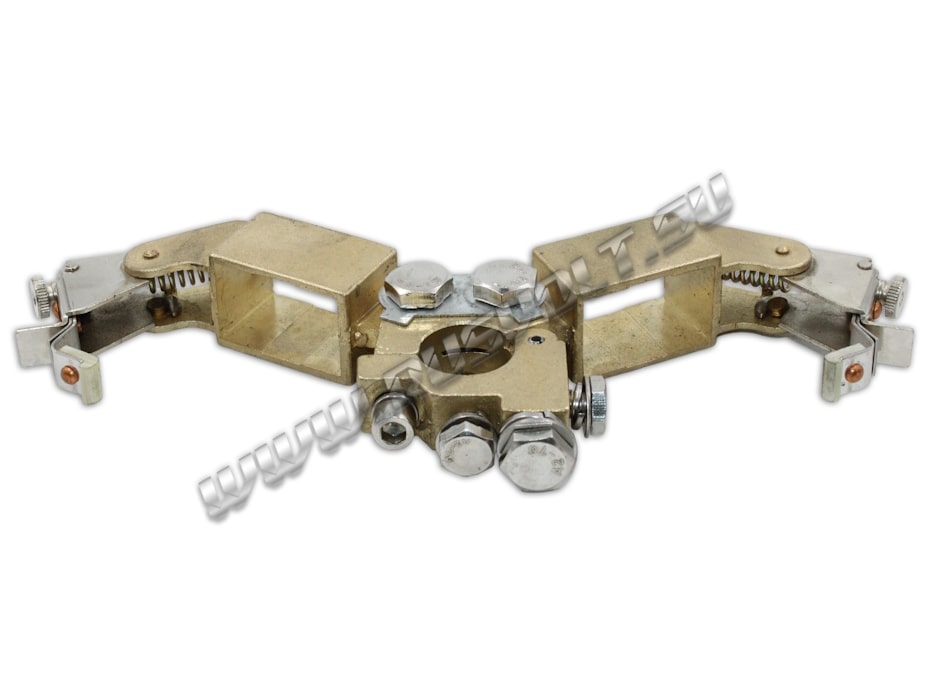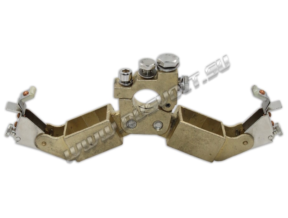 Щёткодержатели DRDF-RV 2/25х40 используются в электрических машинах на блоках контактных колец и входят в состав узлов токосъема. Сделан методом литья из латуни и состоит из двух обойм для электрощеток размером 25х40 мм, прижимных устройств из двух цилиндрических пружин растяжения и изолированными наконечниками рычагов. Усилие нажатия на графитовые щётки регулируется и передаётся при помощи пружин щеткодержателя и рычагов. Сам щеткодержатель крепится на круглый бракет (траверсу) и устанавливается на оси токосъемного кольца. Угол расположения обойм для электрощеток регулируется и фиксируется при помощи болтов.