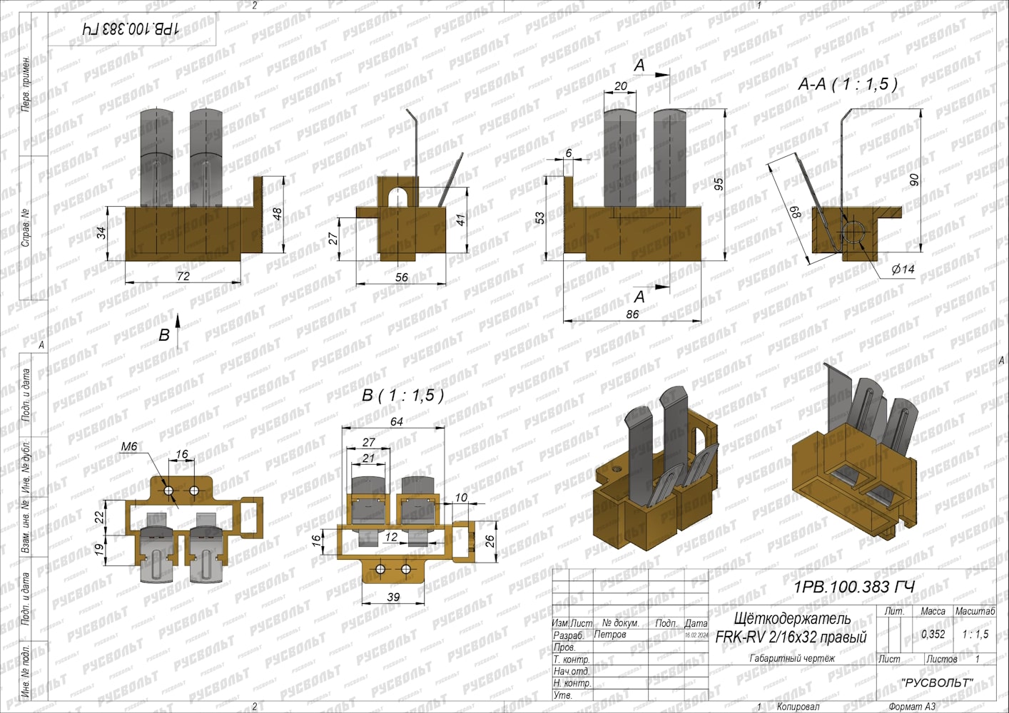 Щеткодержатель FRK-RV 2/16х32 правый (аналог Schunk, Mersen (Carbon Lorraine), Siemens, Pantrac, Lampar, Carls Elektrotechnik, Carbex и Rekofa) - чертеж 1РВ.100.383 ГЧ