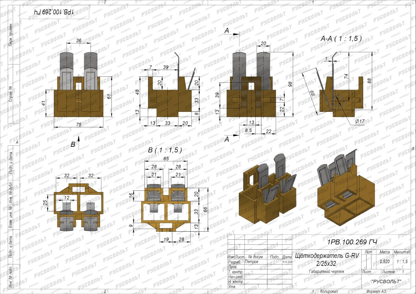 Щеткодержатель G-RV 2/25х32 тип 1 (аналог Schunk, Mersen, Carbone Lorraine, Siemens, Pantrac, Lampar, Rekofa) - чертеж 1РВ.100.269 ГЧ
