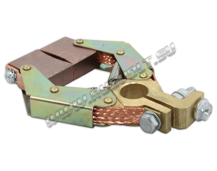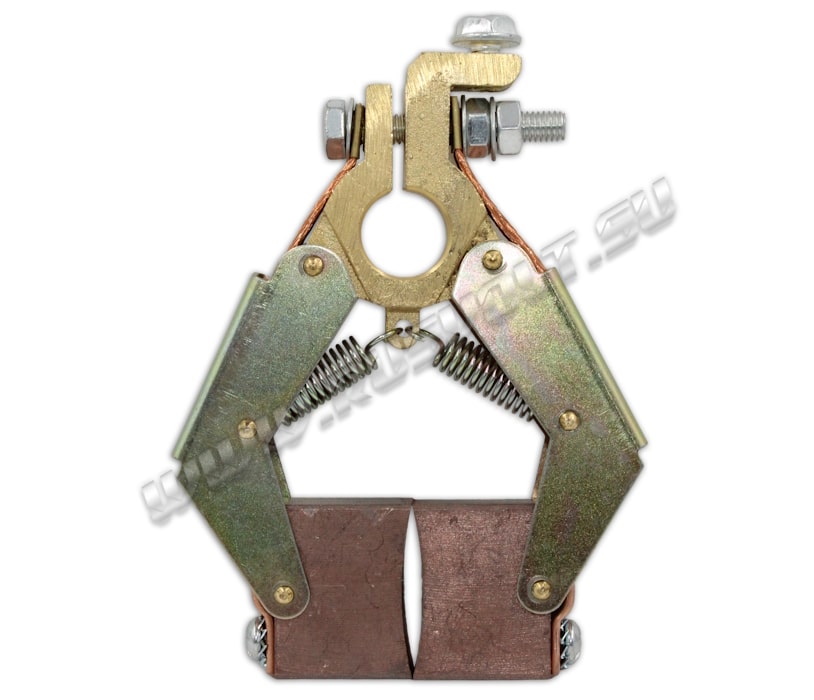 Щёткодержатели SK-RV 12,5x32 d=16 мм, L=68 мм используются в электрических машинах с блоками контактных колец. Диаметр отверстия под бракет 16 мм, длина от центра электрощетки до центра отверстия под бракет 66 мм. Сделан методом штамповки из листовой латуни и состоит из двух обойм для электрощеток с шарнирным креплением, медных гибких шинопроводов из тонких медных проволок по которым осуществляется прохождение тока между электрощетками и зажимом. Давление пружин на графитовые щётки передаётся при помощи цилиндрических пружин растяжения и не регулируется. Сам щеткодержатель подвижный и крепится на круглый бракет (траверсу) и устанавливается на оси токосъемного кольца. В комплекте на выбор идут две меднографитовые электрощетки с шарнирным креплением J164 12,5x32 мм - более твердые, либо J204 12,5x32 мм - более мягкие.