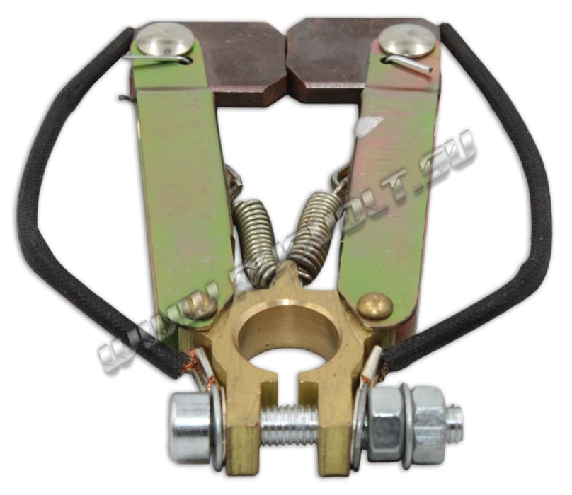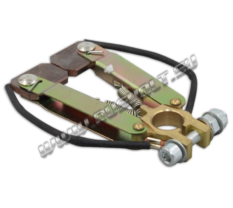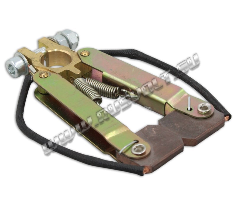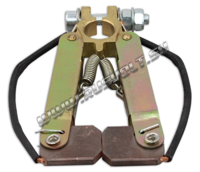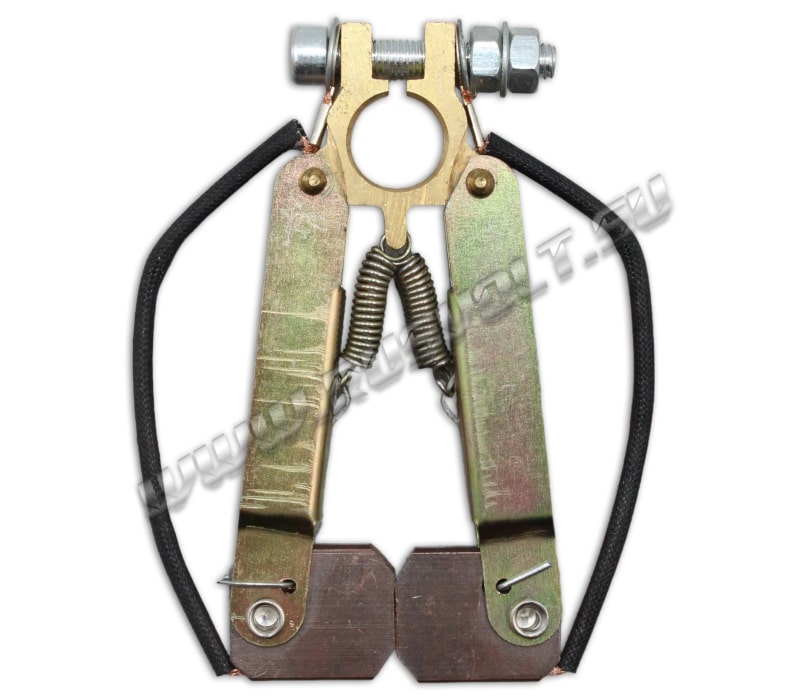 Щёткодержатели SKA-RV 3,5х18 d=12 мм, L=63 мм используются в электрических машинах с блоками контактных колец. Диаметр отверстия под бракет 12 мм, длина от центра электрощетки до центра отверстия под бракет 50 мм. Сделан методом штамповки из листовой латуни и состоит из двух обойм для электрощеток с шарнирным креплением, медных гибких шинопроводов из тонких медных проволок по которым осуществляется прохождение тока между электрощетками и зажимом. Давление пружин на графитовые щётки передаётся при помощи цилиндрических пружин растяжения и не регулируется. Сам щеткодержатель подвижный и крепится на круглый бракет (траверсу) и устанавливается на оси токосъемного кольца. В комплекте на выбор идут две меднографитовые электрощетки с шарнирным креплением J164 3,5х18х20 мм - более твердые, либо J204 6,5х20х20 мм - более мягкие.