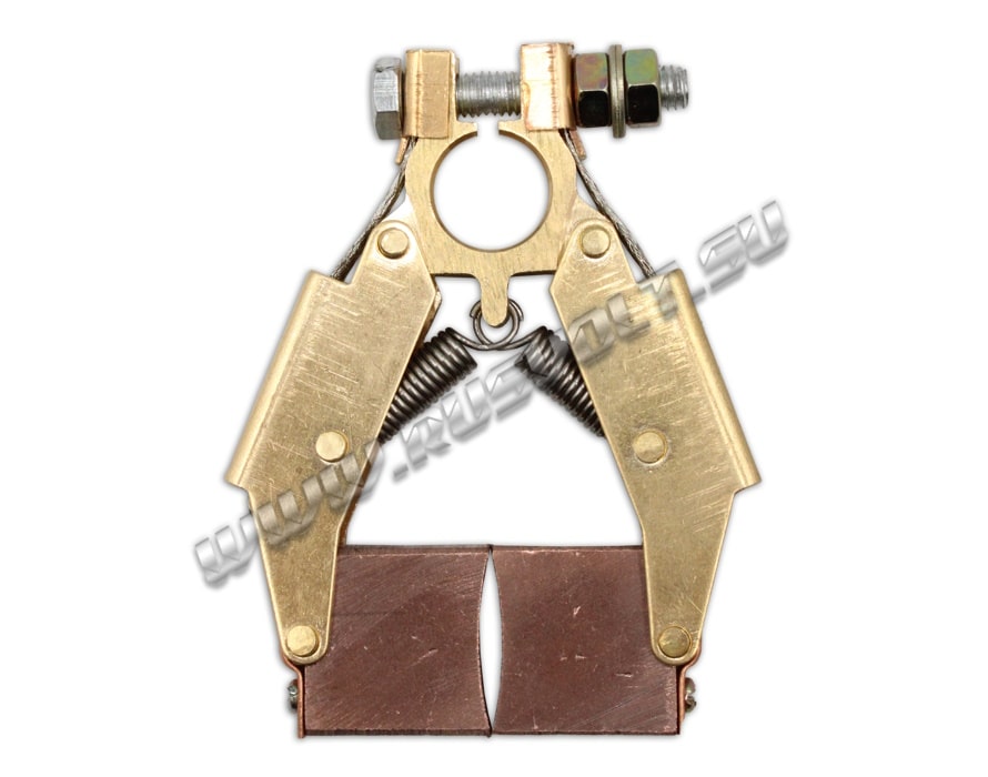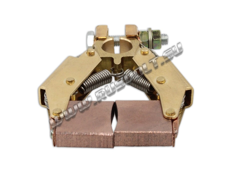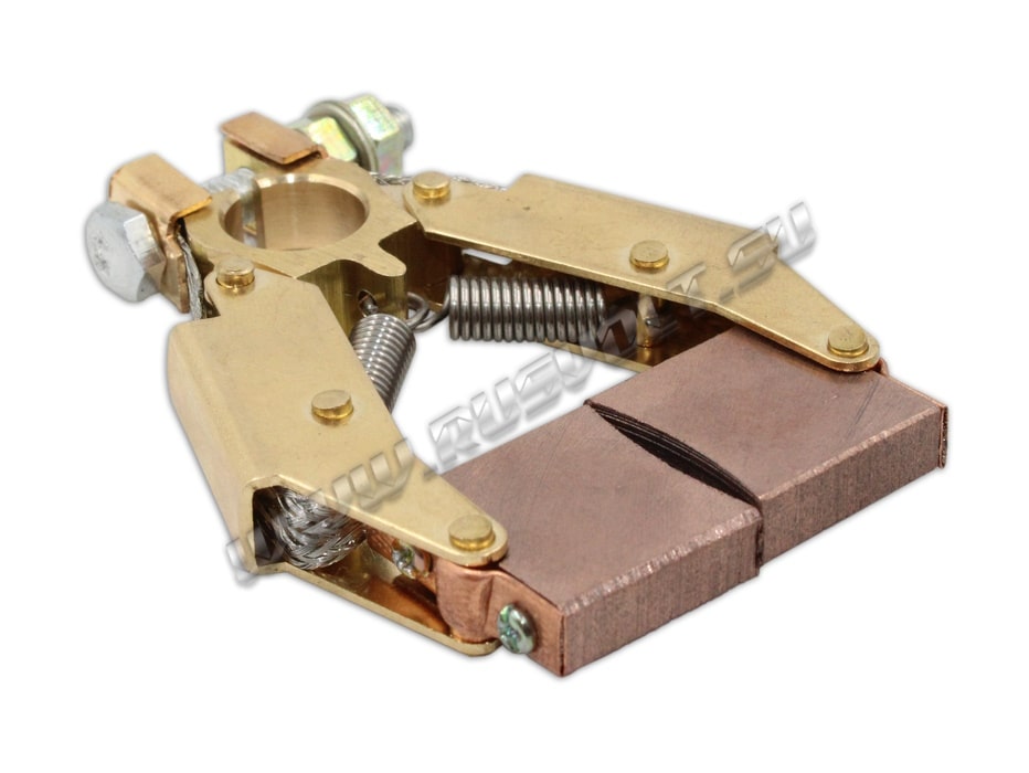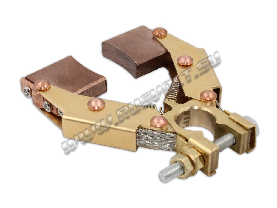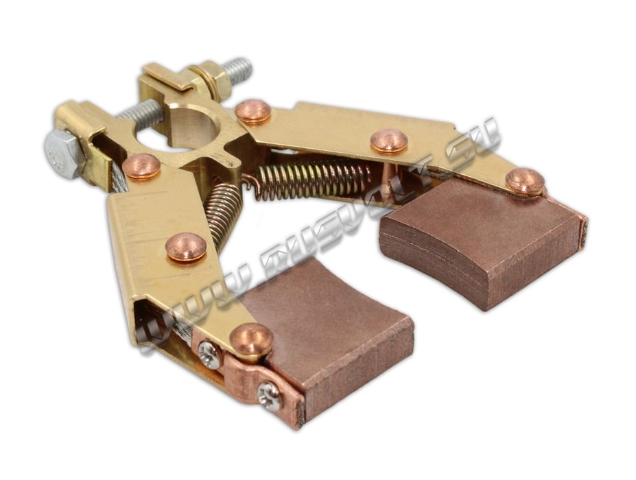 Щёткодержатели SKA-RV 6,5х20 d=12 мм, L=50 мм используются в электрических машинах с блоками контактных колец. Диаметр отверстия под бракет 12 мм, длина от центра электрощетки до центра отверстия под бракет 50 мм. Сделан методом штамповки из листовой латуни и состоит из двух обойм для электрощеток с шарнирным креплением, медных гибких шинопроводов из тонких медных проволок по которым осуществляется прохождение тока между электрощетками и зажимом. Давление пружин на графитовые щётки передаётся при помощи цилиндрических пружин растяжения и не регулируется. Сам щеткодержатель подвижный и крепится на круглый бракет (траверсу) и устанавливается на оси токосъемного кольца. В комплекте на выбор идут две меднографитовые электрощетки с шарнирным креплением J164 6,5х20х20 мм - более твердые, либо J204 6,5х20х20 мм - более мягкие.