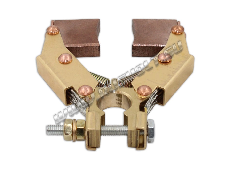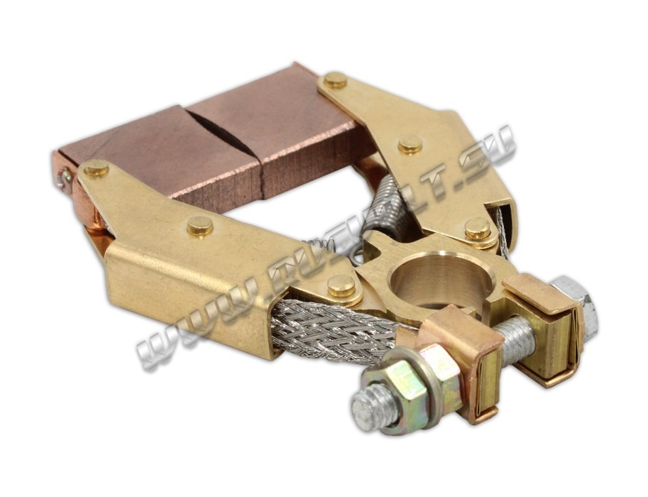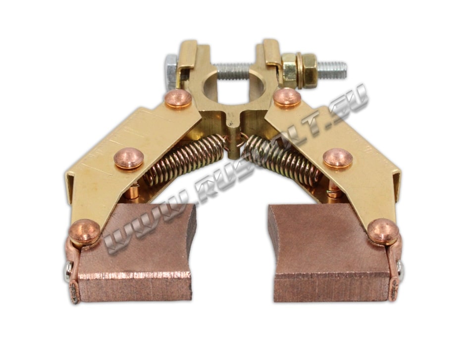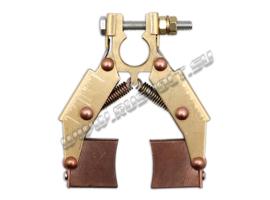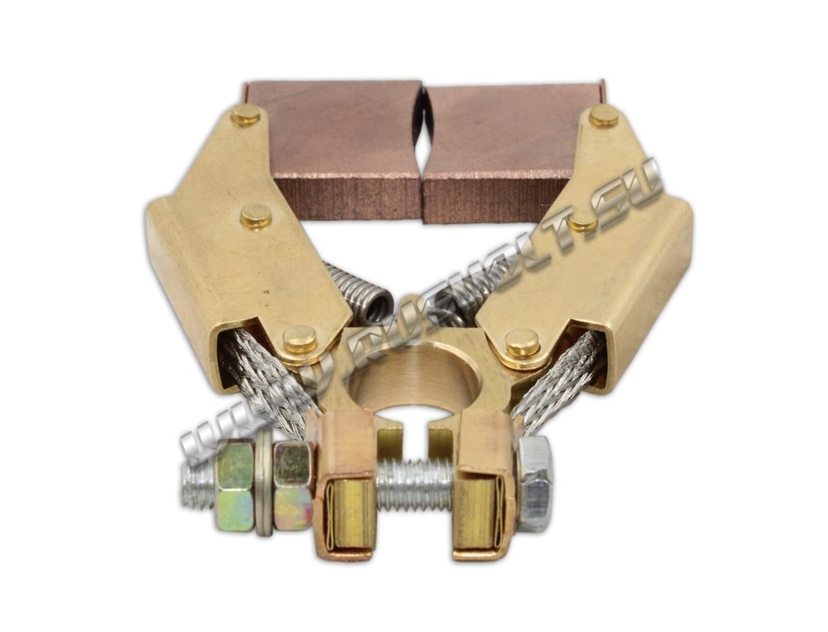 Щёткодержатели SKA-RV 6,5х20 d=12 мм, L=50 мм используются в электрических машинах с блоками контактных колец. Диаметр отверстия под бракет 12 мм, длина от центра электрощетки до центра отверстия под бракет 50 мм. Сделан методом штамповки из листовой латуни и состоит из двух обойм для электрощеток с шарнирным креплением, медных гибких шинопроводов из тонких медных проволок по которым осуществляется прохождение тока между электрощетками и зажимом. Давление пружин на графитовые щётки передаётся при помощи цилиндрических пружин растяжения и не регулируется. Сам щеткодержатель подвижный и крепится на круглый бракет (траверсу) и устанавливается на оси токосъемного кольца. В комплекте на выбор идут две меднографитовые электрощетки с шарнирным креплением J164 6,5х20х20 мм - более твердые, либо J204 6,5х20х20 мм - более мягкие.