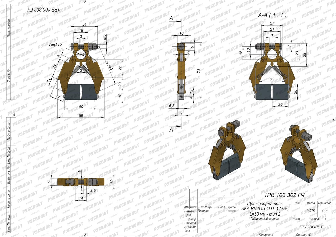 Щеткодержатель SKA-RV 6,5х20 d=12 мм, L=50 мм - тип 2 (аналог Schunk, Mersen, Carbone Lorraine, Siemens, Pantrac, Lampar, Rekofa) - чертеж 1РВ.100.302 ГЧ