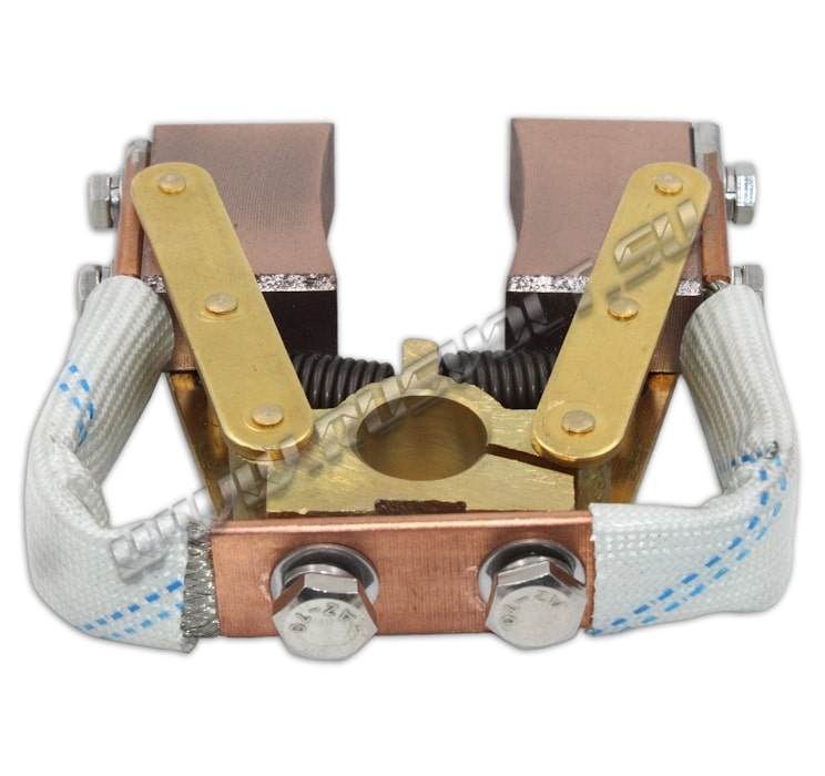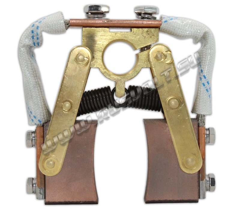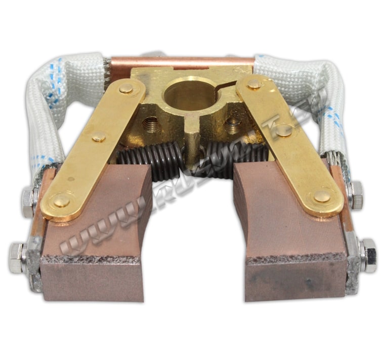Щёткодержатели SKC-RV 20х50 d=20 мм, L=70 мм используются в узлах токосъема вместе с блоками контактных колец. Диаметр отверстия под бракет 20 мм, длина от центра электрощетки до центра отверстия под бракет 70 мм. Сделан частично методом штамповки из листовой латуни, а так же из латунного бруска и состоит из двух шарнирных креплений электрощеток с медными гибкими шинопроводами из медных изолированных проволок по которым осуществляется прохождение тока между электрощетками и болтовым креплением поводков к щеткам. Давление пружин на графитовые щётки передаётся при помощи цилиндрических пружин растяжения (прижимной механизм щеткодержателя) и не регулируется. Сам щеткодержатель подвижный и крепится на круглый бракет (траверсу) и устанавливается на оси токосъемного кольца. В комплекте на выбор идут две импортные меднографитовые электрощетки с шарнирным креплением J164 20х50 мм - более твердые, либо J204 20х50 мм - более мягкие.