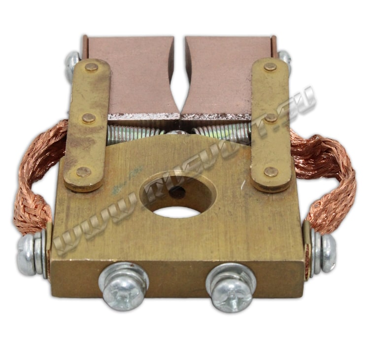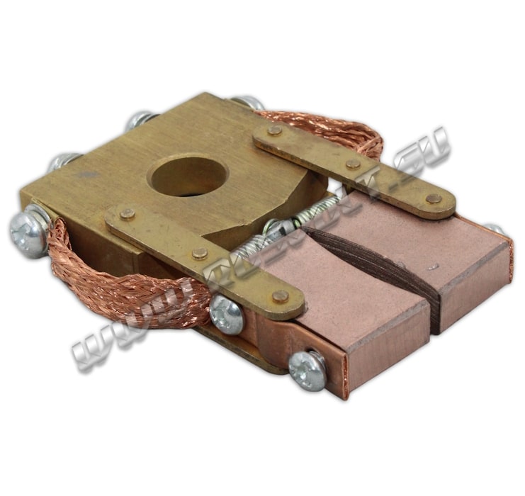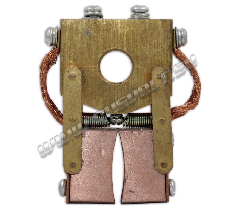 Щёткодержатели SKCF-RV 12х40 d=17 мм, L=52 мм используются в узлах токосъема вместе с блоками контактных колец. Диаметр отверстия под бракет 17 мм, длина от центра электрощетки до центра отверстия под бракет 52 мм. Сделан частично методом штамповки из листовой стали, а так же из бруска латуни и состоит из двух шарнирных креплений электрощеток с медными гибкими шинопроводами из медных проволок по которым осуществляется прохождение тока между электрощетками и болтовым креплением поводков к щеткам. Давление пружин на графитовые щётки передаётся при помощи цилиндрических пружин растяжения (прижимной механизм щеткодержателя) и не регулируется. Сам щеткодержатель подвижный и крепится на круглый бракет (траверсу) и устанавливается на оси токосъемного кольца. В комплекте на выбор идут две импортные меднографитовые электрощетки с шарнирным креплением J164 12х40 мм - более твердые, либо J204 12х40 мм - более мягкие.