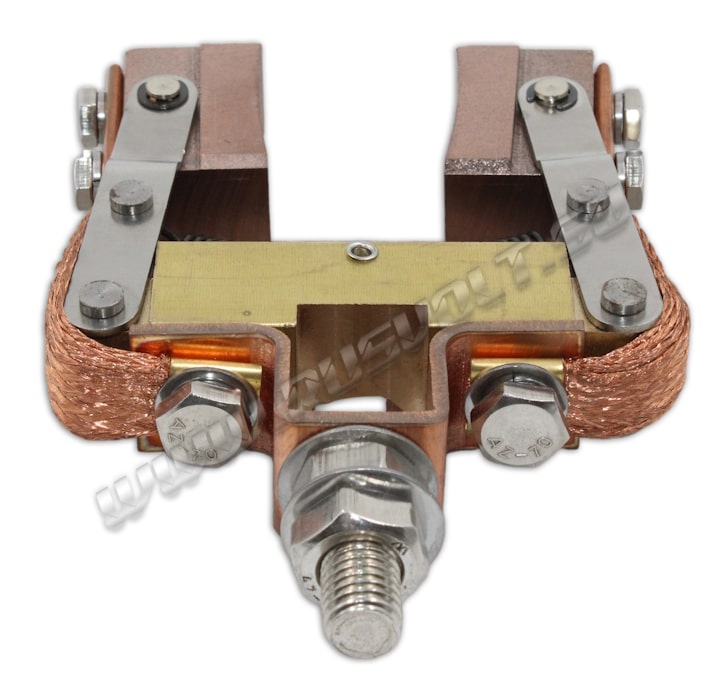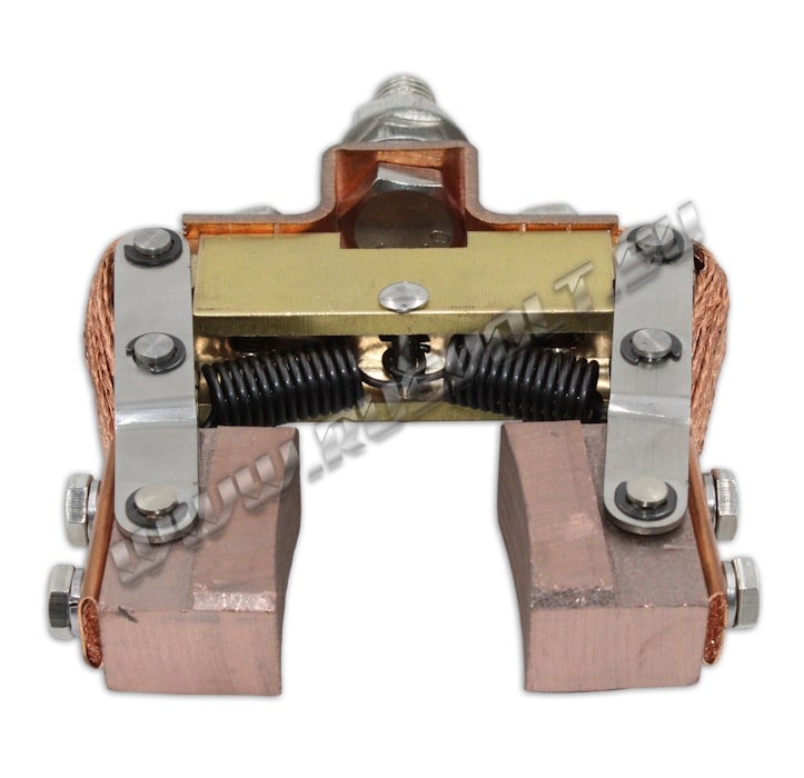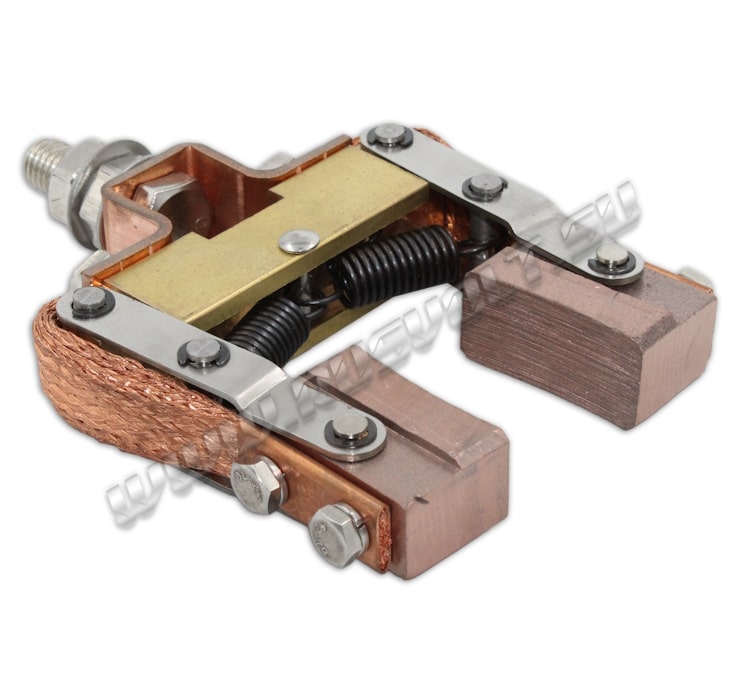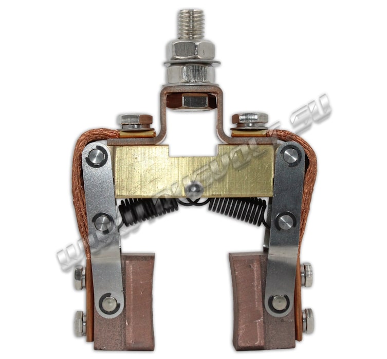 Щёткодержатели SKCG-RV 20x40 используются в узлах токосъема вместе с блоками контактных колец. Сделан частично методом штамповки из листовой стали, а так же из бруска латуни и состоит из двух шарнирных креплений электрощеток с медными гибкими шинопроводами из медных проволок по которым осуществляется прохождение тока между электрощетками и болтовым креплением поводков к щеткам. Давление пружин на графитовые щётки передаётся при помощи цилиндрических пружин растяжения (прижимной механизм щеткодержателя) и не регулируется. Сам щеткодержатель подвижный, крепится на бракет (траверсу) и устанавливается на оси токосъемного кольца. В комплекте на выбор идут две меднографитовые импортные электрощетки с шарнирным креплением J164 20x40 мм - более твердые, либо J204 20x40 мм - более мягкие.