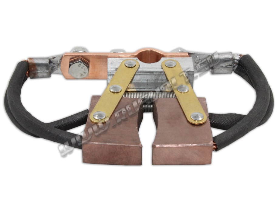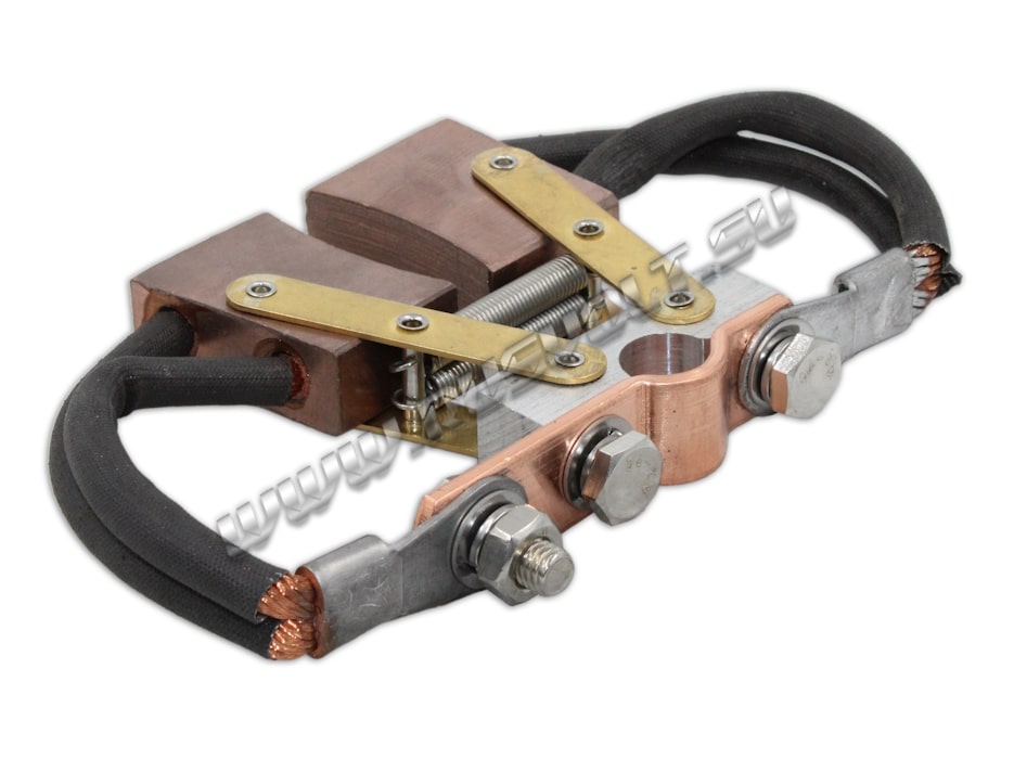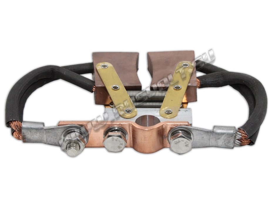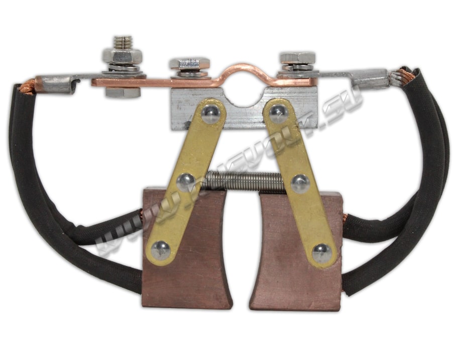 Щёткодержатели SKCL-RV 16х46 d=16 мм, L=70 мм используются в узлах токосъема вместе с блоками контактных колец. Диаметр отверстия под бракет 16 мм, длина от центра электрощетки до центра отверстия под бракет 70 мм. Сделан частично методом штамповки из листовой латуни, а так же из стального бруска и состоит из двух шарнирных креплений электрощеток с медными гибкими шинопроводами из медных проволок по которым осуществляется прохождение тока между электрощетками и болтовым креплением поводков к щеткам. Давление пружин на графитовые щётки передаётся при помощи цилиндрических пружин растяжения (прижимной механизм щеткодержателя) и не регулируется. Сам щеткодержатель подвижный и крепится на круглый бракет (траверсу) и устанавливается на оси токосъемного кольца. В комплекте на выбор идут две импортные меднографитовые электрощетки с изоляцией поводков и шарнирным креплением J164 16х46 мм - более твердые, либо J204 16х46 мм - более мягкие.