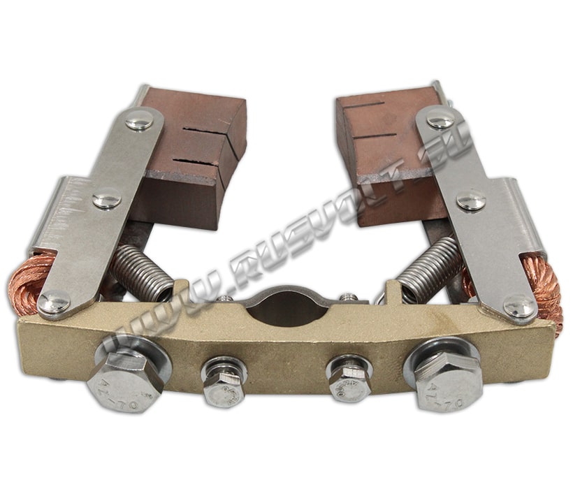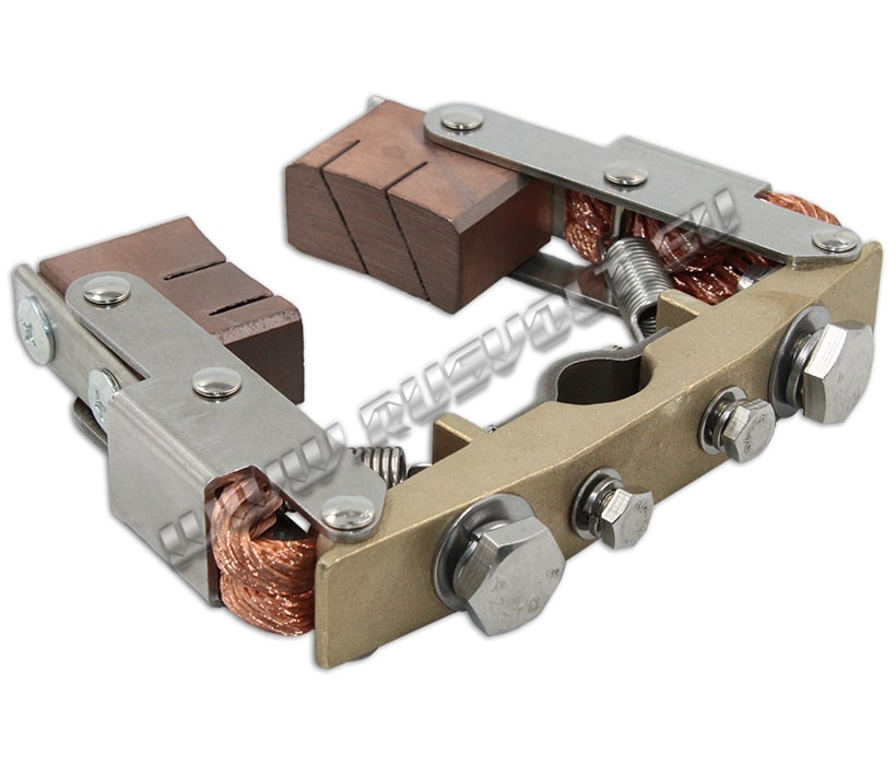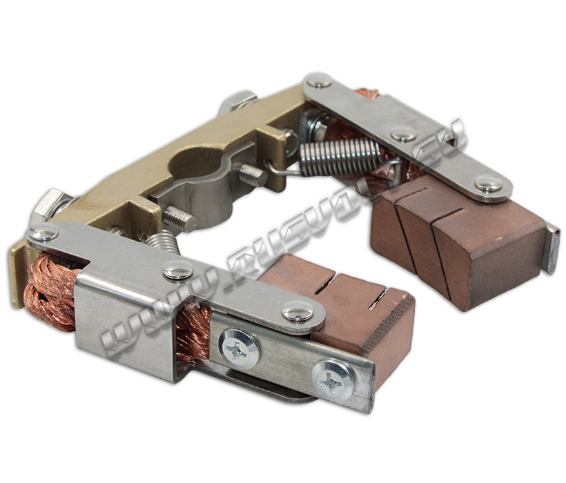 Щёткодержатели SKCN-RV 20x40 d=20 мм используются в узлах токосъема вместе с блоками контактных колец. Сделан частично методом штамповки из листовой стали, а так же из бруска латуни и состоит из двух шарнирных креплений электрощеток с медными гибкими шинопроводами из медных проволок по которым осуществляется прохождение тока между электрощетками и болтовым креплением поводков к щеткам. Давление пружин на графитовые щётки передаётся при помощи цилиндрических пружин растяжения (прижимной механизм щеткодержателя) и не регулируется. Сам щеткодержатель подвижный, крепится на круглый бракет (траверсу) диаметром 20 мм и устанавливается на оси токосъемного кольца. В комплекте на выбор идут две меднографитовые импортные электрощетки с шарнирным креплением J164 20х40 мм - более твердые, либо J201 20х40 мм - более мягкие.