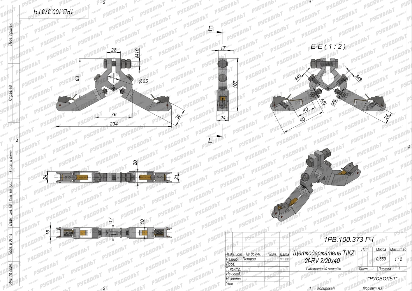 Щеткодержатель TIKZ 2f-RV 2/20х40 (аналог Schunk, Mersen, Carbone Lorraine, Siemens, Pantrac, Lampar, Rekofa) - чертеж 1РВ.100.373 ГЧ
