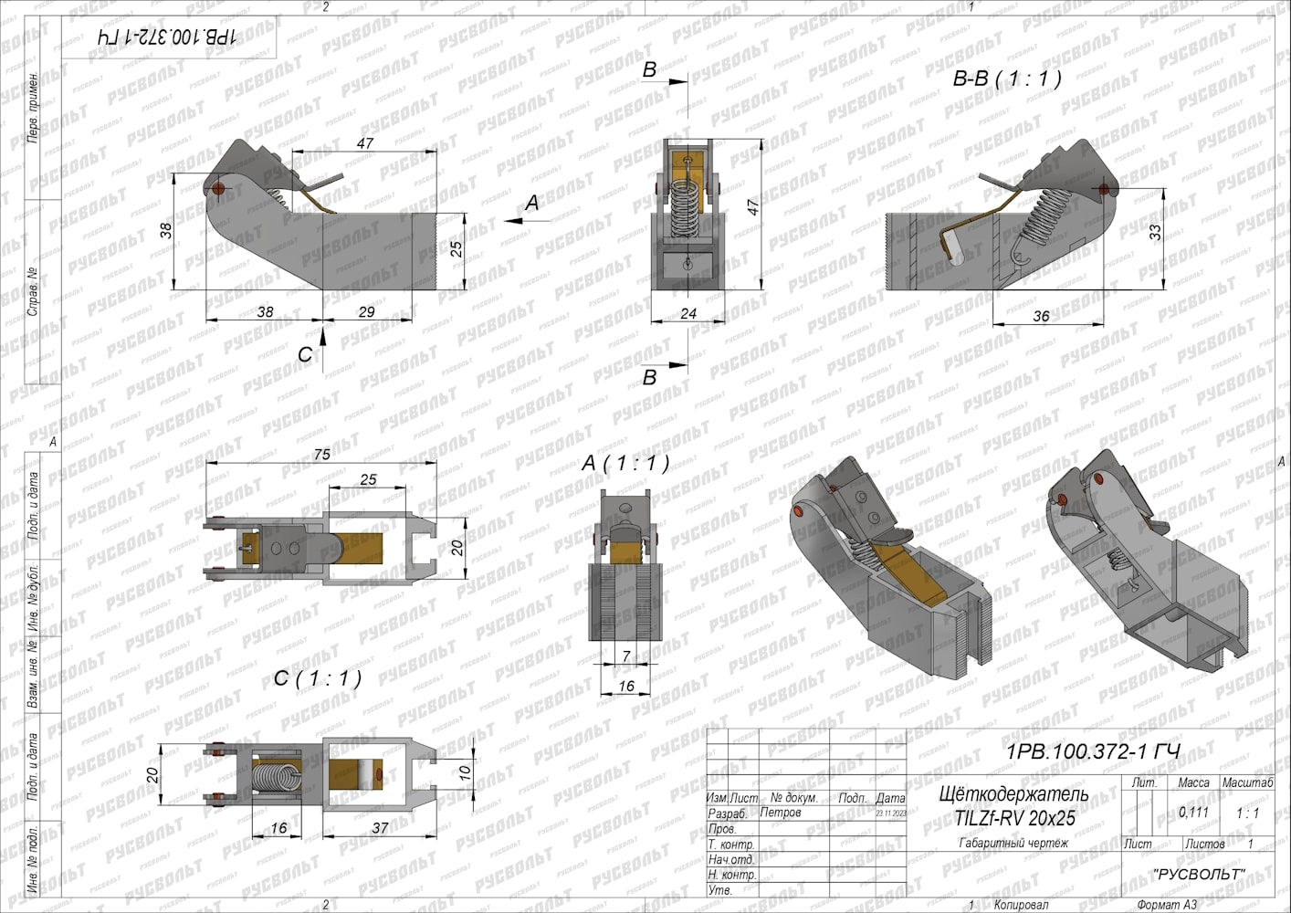 Щеткодержатель TILZf-RV 20х25 (аналог Schunk, Mersen (Carbon Lorraine), Siemens, Pantrac, Lampar, Carls Elektrotechnik, Carbex и Rekofa) - чертеж 1РВ.100.372-1 ГЧ