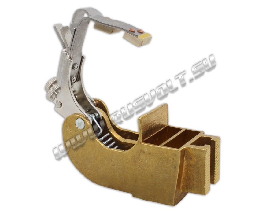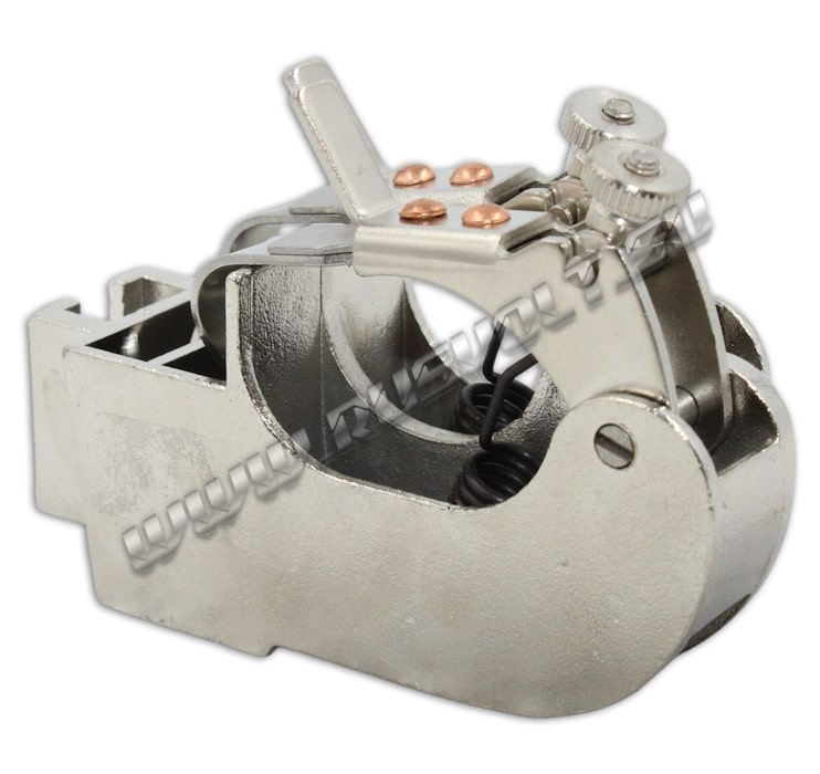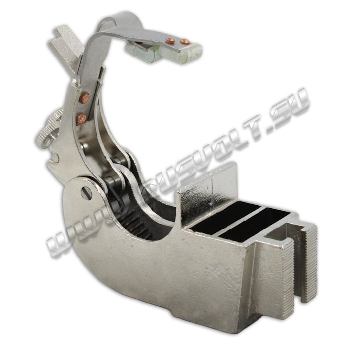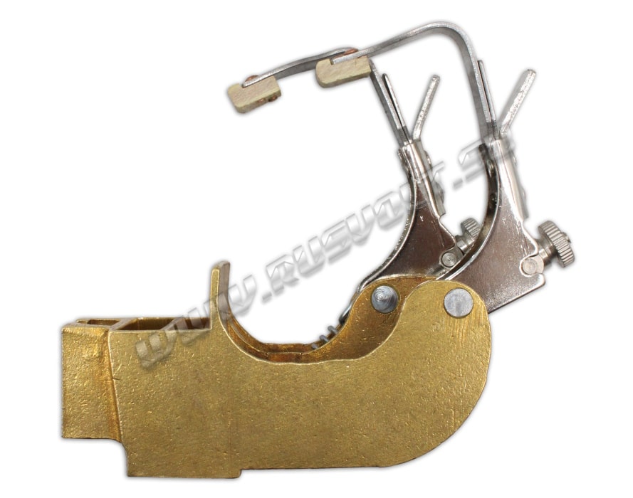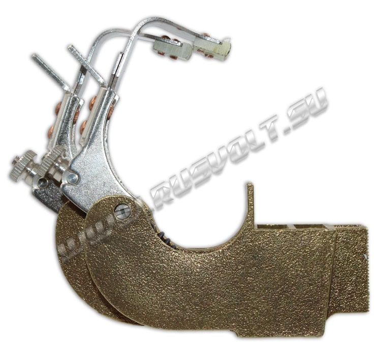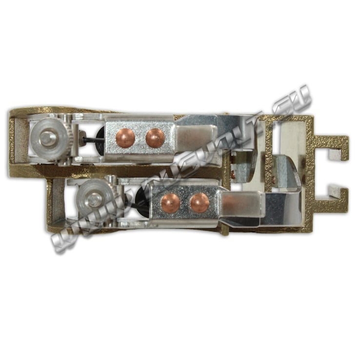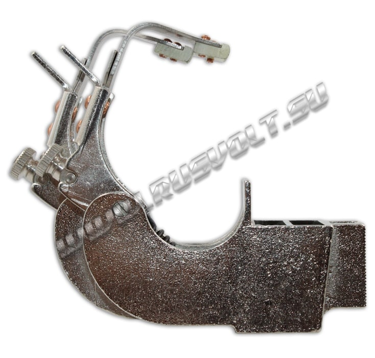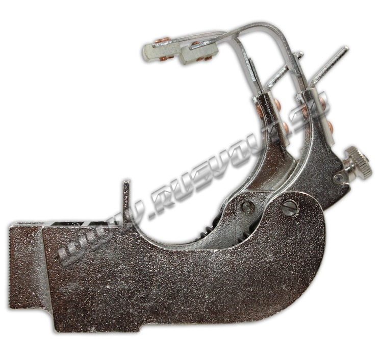 Щёткодержатель TNC-RV 2/10х32 (возможные аналоги TNC3-1032 10х32 Schunk чертеж 06.07.0094.14 и TTo7-1032 10х32 Mersen (Carbon Lorraine)) состоит из двух скошенных обойм и двух нажимных устройств, обеспечивающих прилегание щеток к коллектору с необходимым усилием. Давление регулируемое и на графитовые щетки передаётся при помощи двух рычагов с цилиндрическими пружинами растяжения, наконечники рычагов изготовлены из текстолита. Сам щеткодержатель крепится на бракет (траверсу). Изготавливается под давлением из латуни или стали с помощью фрезерной обработки путем протяжки, сверления и запиловки.