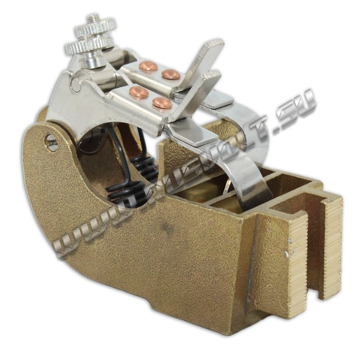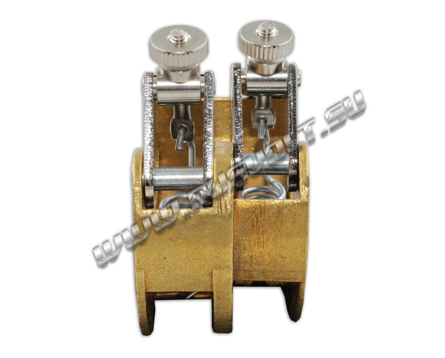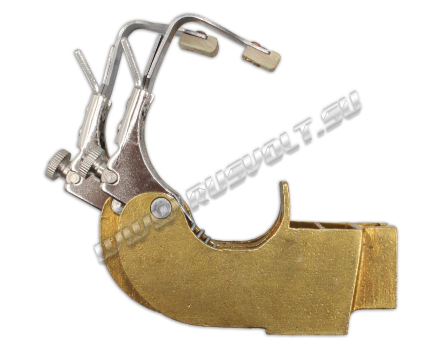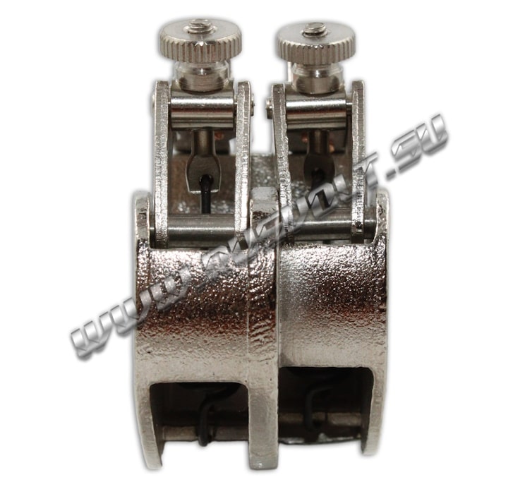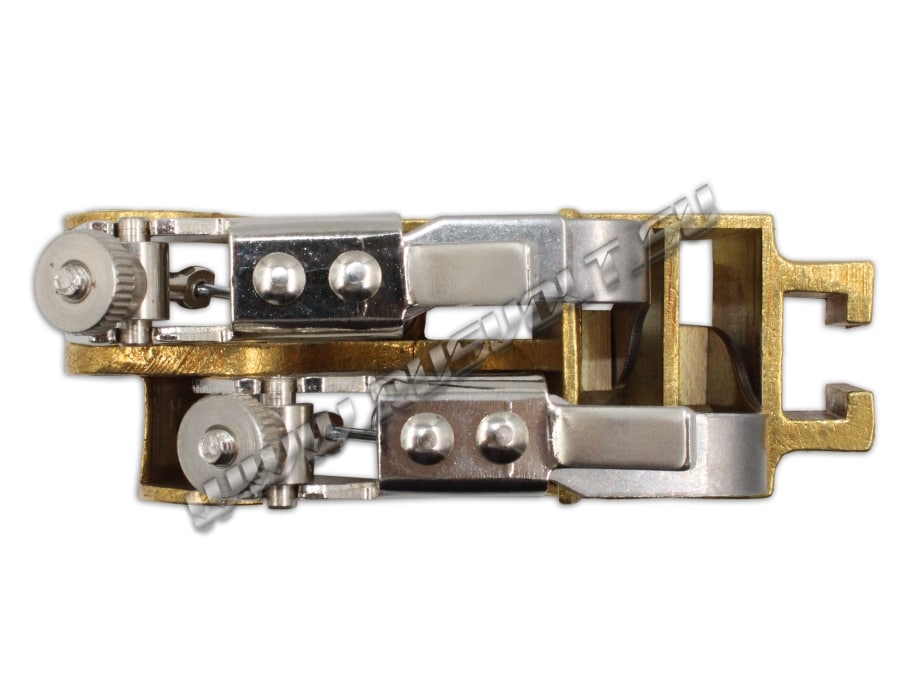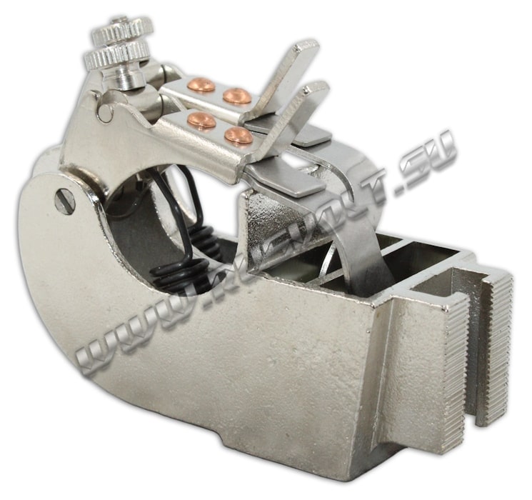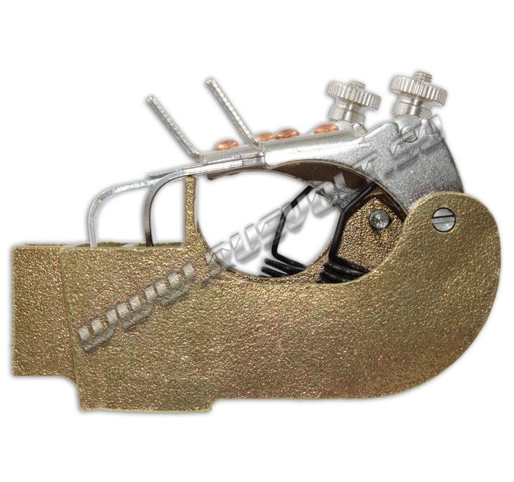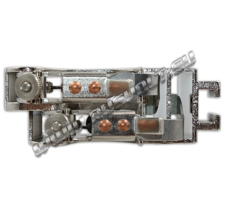 Щёткодержатель TNC-RV 2/10х32 (возможные аналоги TNC3-1032 10х32 Schunk чертеж 06.07.0094.14 и TTo7-1032 10х32 Mersen (Carbon Lorraine)) состоит из двух скошенных обойм и двух нажимных устройств, обеспечивающих прилегание щеток к коллектору с необходимым усилием. Давление регулируемое и на графитовые щетки передаётся при помощи двух рычагов с цилиндрическими пружинами растяжения, наконечники рычагов изготовлены из текстолита. Сам щеткодержатель крепится на бракет (траверсу). Изготавливается под давлением из латуни или стали с помощью фрезерной обработки путем протяжки, сверления и запиловки.